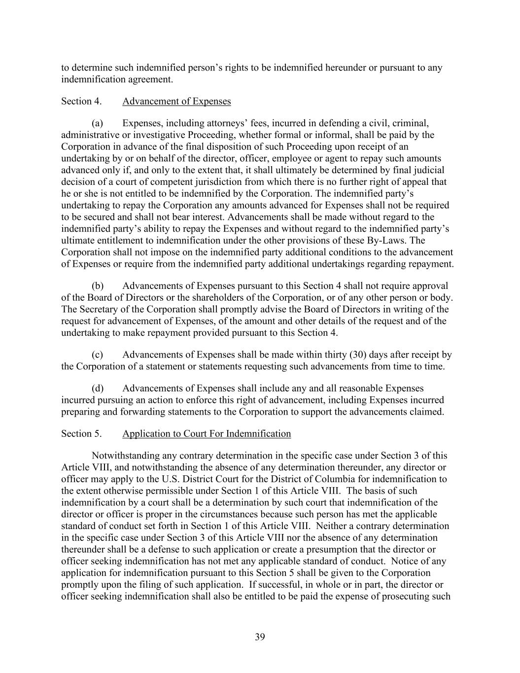 39 to determine such indemnified person’s rights to be indemnified hereunder or pursuant to any indemnification agreement. Section 4. Advancement of Expenses (a) Expenses, including attorneys’ fees, incurred in defending a civil, criminal, administrative or investigative Proceeding, whether formal or informal, shall be paid by the Corporation in advance of the final disposition of such Proceeding upon receipt of an undertaking by or on behalf of the director, officer, employee or agent to repay such amounts advanced only if, and only to the extent that, it shall ultimately be determined by final judicial decision of a court of competent jurisdiction from which there is no further right of appeal that he or she is not entitled to be indemnified by the Corporation. The indemnified party’s undertaking to repay the Corporation any amounts advanced for Expenses shall not be required to be secured and shall not bear interest. Advancements shall be made without regard to the indemnified party’s ability to repay the Expenses and without regard to the indemnified party’s ultimate entitlement to indemnification under the other provisions of these By-Laws. The Corporation shall not impose on the indemnified party additional conditions to the advancement of Expenses or require from the indemnified party additional undertakings regarding repayment. (b) Advancements of Expenses pursuant to this Section 4 shall not require approval of the Board of Directors or the shareholders of the Corporation, or of any other person or body. The Secretary of the Corporation shall promptly advise the Board of Directors in writing of the request for advancement of Expenses, of the amount and other details of the request and of the undertaking to make repayment provided pursuant to this Section 4. (c) Advancements of Expenses shall be made within thirty (30) days after receipt by the Corporation of a statement or statements requesting such advancements from time to time. (d) Advancements of Expenses shall include any and all reasonable Expenses incurred pursuing an action to enforce this right of advancement, including Expenses incurred preparing and forwarding statements to the Corporation to support the advancements claimed. Section 5. Application to Court For Indemnification Notwithstanding any contrary determination in the specific case under Section 3 of this Article VIII, and notwithstanding the absence of any determination thereunder, any director or officer may apply to the U.S. District Court for the District of Columbia for indemnification to the extent otherwise permissible under Section 1 of this Article VIII. The basis of such indemnification by a court shall be a determination by such court that indemnification of the director or officer is proper in the circumstances because such person has met the applicable standard of conduct set forth in Section 1 of this Article VIII. Neither a contrary determination in the specific case under Section 3 of this Article VIII nor the absence of any determination thereunder shall be a defense to such application or create a presumption that the director or officer seeking indemnification has not met any applicable standard of conduct. Notice of any application for indemnification pursuant to this Section 5 shall be given to the Corporation promptly upon the filing of such application. If successful, in whole or in part, the director or officer seeking indemnification shall also be entitled to be paid the expense of prosecuting such