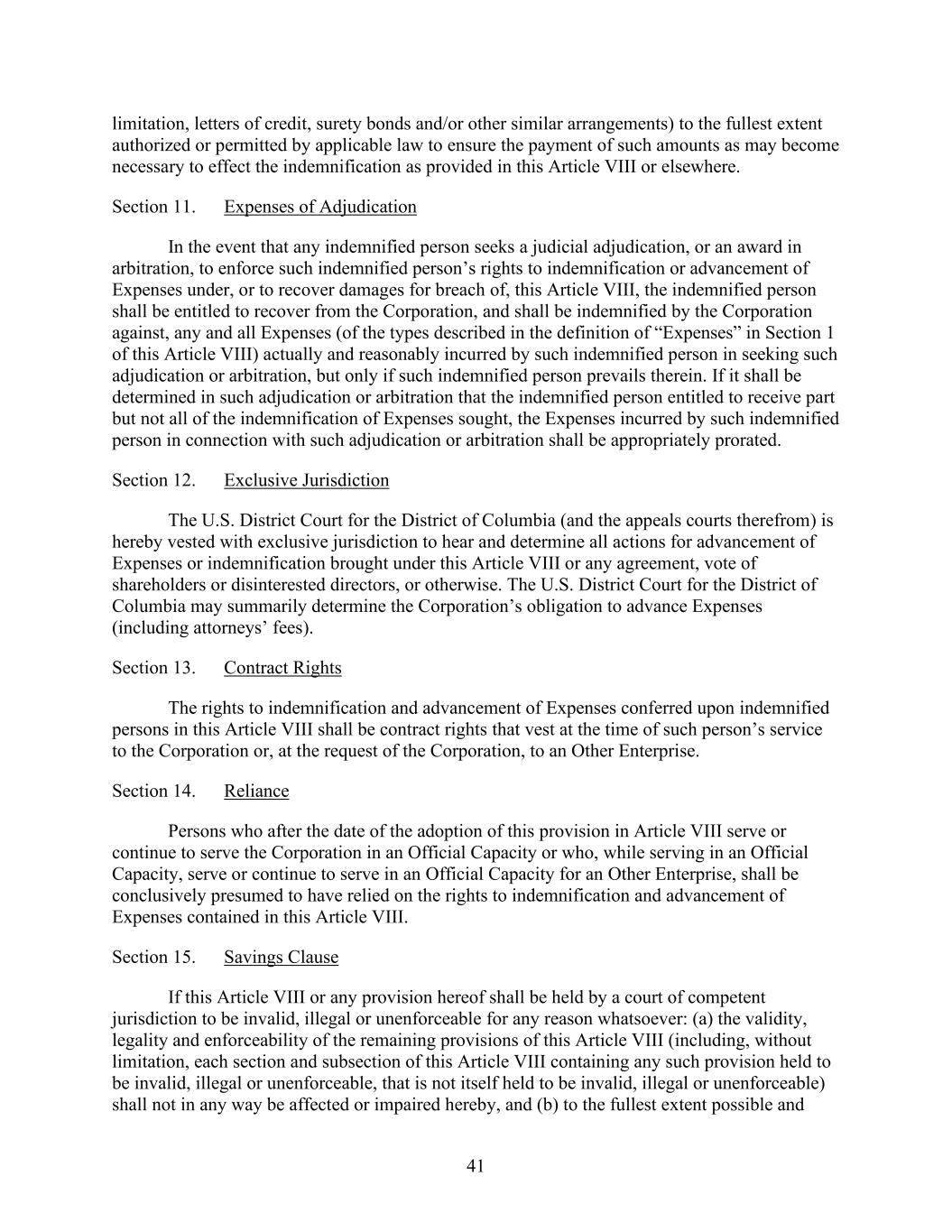 41 limitation, letters of credit, surety bonds and/or other similar arrangements) to the fullest extent authorized or permitted by applicable law to ensure the payment of such amounts as may become necessary to effect the indemnification as provided in this Article VIII or elsewhere. Section 11. Expenses of Adjudication In the event that any indemnified person seeks a judicial adjudication, or an award in arbitration, to enforce such indemnified person’s rights to indemnification or advancement of Expenses under, or to recover damages for breach of, this Article VIII, the indemnified person shall be entitled to recover from the Corporation, and shall be indemnified by the Corporation against, any and all Expenses (of the types described in the definition of “Expenses” in Section 1 of this Article VIII) actually and reasonably incurred by such indemnified person in seeking such adjudication or arbitration, but only if such indemnified person prevails therein. If it shall be determined in such adjudication or arbitration that the indemnified person entitled to receive part but not all of the indemnification of Expenses sought, the Expenses incurred by such indemnified person in connection with such adjudication or arbitration shall be appropriately prorated. Section 12. Exclusive Jurisdiction The U.S. District Court for the District of Columbia (and the appeals courts therefrom) is hereby vested with exclusive jurisdiction to hear and determine all actions for advancement of Expenses or indemnification brought under this Article VIII or any agreement, vote of shareholders or disinterested directors, or otherwise. The U.S. District Court for the District of Columbia may summarily determine the Corporation’s obligation to advance Expenses (including attorneys’ fees). Section 13. Contract Rights The rights to indemnification and advancement of Expenses conferred upon indemnified persons in this Article VIII shall be contract rights that vest at the time of such person’s service to the Corporation or, at the request of the Corporation, to an Other Enterprise. Section 14. Reliance Persons who after the date of the adoption of this provision in Article VIII serve or continue to serve the Corporation in an Official Capacity or who, while serving in an Official Capacity, serve or continue to serve in an Official Capacity for an Other Enterprise, shall be conclusively presumed to have relied on the rights to indemnification and advancement of Expenses contained in this Article VIII. Section 15. Savings Clause If this Article VIII or any provision hereof shall be held by a court of competent jurisdiction to be invalid, illegal or unenforceable for any reason whatsoever: (a) the validity, legality and enforceability of the remaining provisions of this Article VIII (including, without limitation, each section and subsection of this Article VIII containing any such provision held to be invalid, illegal or unenforceable, that is not itself held to be invalid, illegal or unenforceable) shall not in any way be affected or impaired hereby, and (b) to the fullest extent possible and