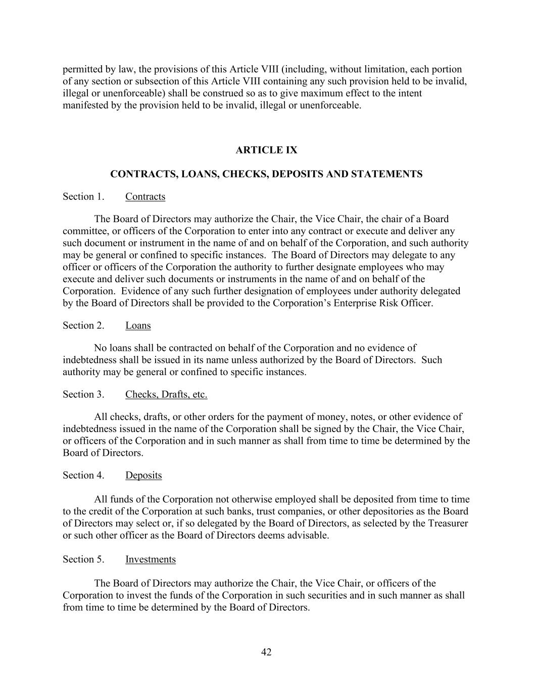 42 permitted by law, the provisions of this Article VIII (including, without limitation, each portion of any section or subsection of this Article VIII containing any such provision held to be invalid, illegal or unenforceable) shall be construed so as to give maximum effect to the intent manifested by the provision held to be invalid, illegal or unenforceable. ARTICLE IX CONTRACTS, LOANS, CHECKS, DEPOSITS AND STATEMENTS Section 1. Contracts The Board of Directors may authorize the Chair, the Vice Chair, the chair of a Board committee, or officers of the Corporation to enter into any contract or execute and deliver any such document or instrument in the name of and on behalf of the Corporation, and such authority may be general or confined to specific instances. The Board of Directors may delegate to any officer or officers of the Corporation the authority to further designate employees who may execute and deliver such documents or instruments in the name of and on behalf of the Corporation. Evidence of any such further designation of employees under authority delegated by the Board of Directors shall be provided to the Corporation’s Enterprise Risk Officer. Section 2. Loans No loans shall be contracted on behalf of the Corporation and no evidence of indebtedness shall be issued in its name unless authorized by the Board of Directors. Such authority may be general or confined to specific instances. Section 3. Checks, Drafts, etc. All checks, drafts, or other orders for the payment of money, notes, or other evidence of indebtedness issued in the name of the Corporation shall be signed by the Chair, the Vice Chair, or officers of the Corporation and in such manner as shall from time to time be determined by the Board of Directors. Section 4. Deposits All funds of the Corporation not otherwise employed shall be deposited from time to time to the credit of the Corporation at such banks, trust companies, or other depositories as the Board of Directors may select or, if so delegated by the Board of Directors, as selected by the Treasurer or such other officer as the Board of Directors deems advisable. Section 5. Investments The Board of Directors may authorize the Chair, the Vice Chair, or officers of the Corporation to invest the funds of the Corporation in such securities and in such manner as shall from time to time be determined by the Board of Directors.