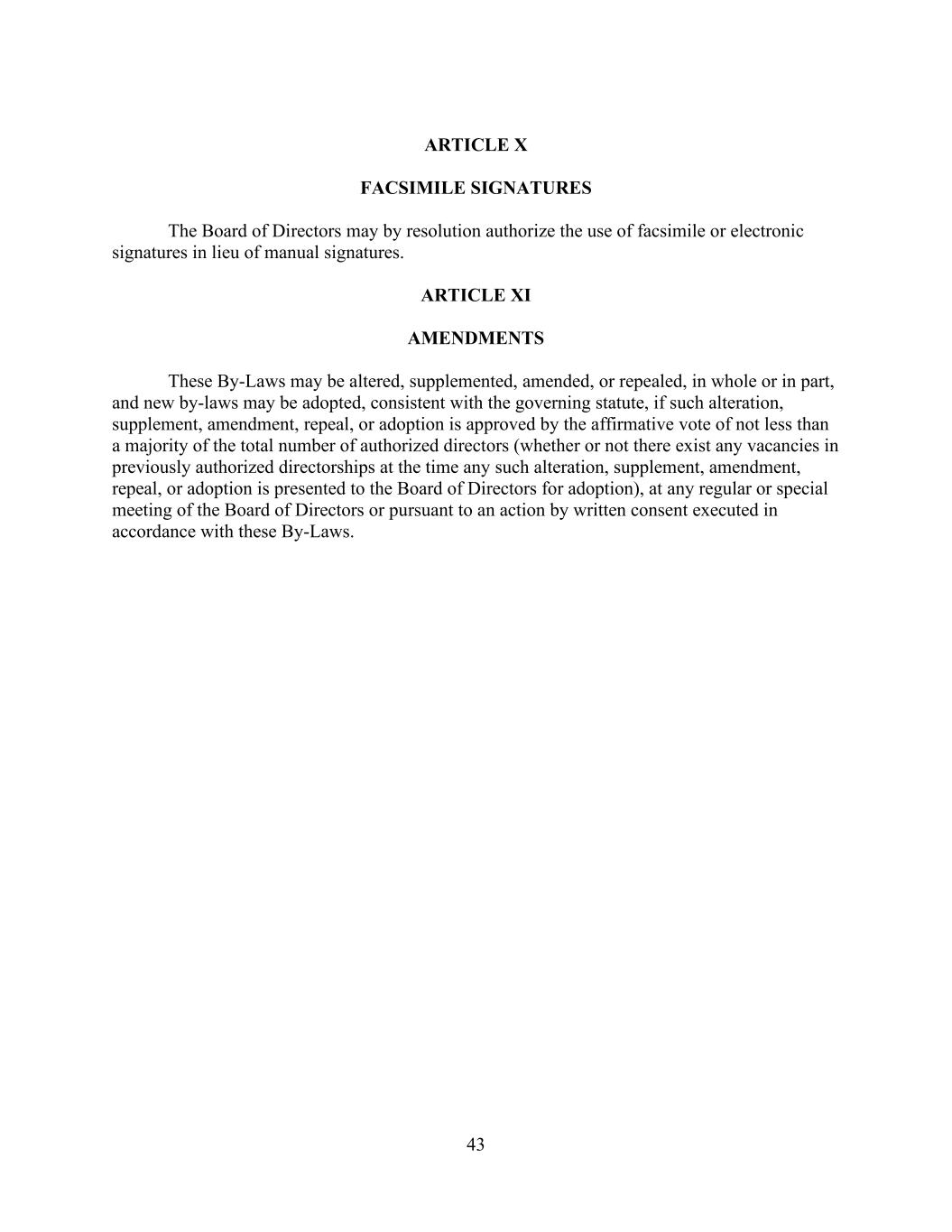 43 ARTICLE X FACSIMILE SIGNATURES The Board of Directors may by resolution authorize the use of facsimile or electronic signatures in lieu of manual signatures. ARTICLE XI AMENDMENTS These By-Laws may be altered, supplemented, amended, or repealed, in whole or in part, and new by-laws may be adopted, consistent with the governing statute, if such alteration, supplement, amendment, repeal, or adoption is approved by the affirmative vote of not less than a majority of the total number of authorized directors (whether or not there exist any vacancies in previously authorized directorships at the time any such alteration, supplement, amendment, repeal, or adoption is presented to the Board of Directors for adoption), at any regular or special meeting of the Board of Directors or pursuant to an action by written consent executed in accordance with these By-Laws.