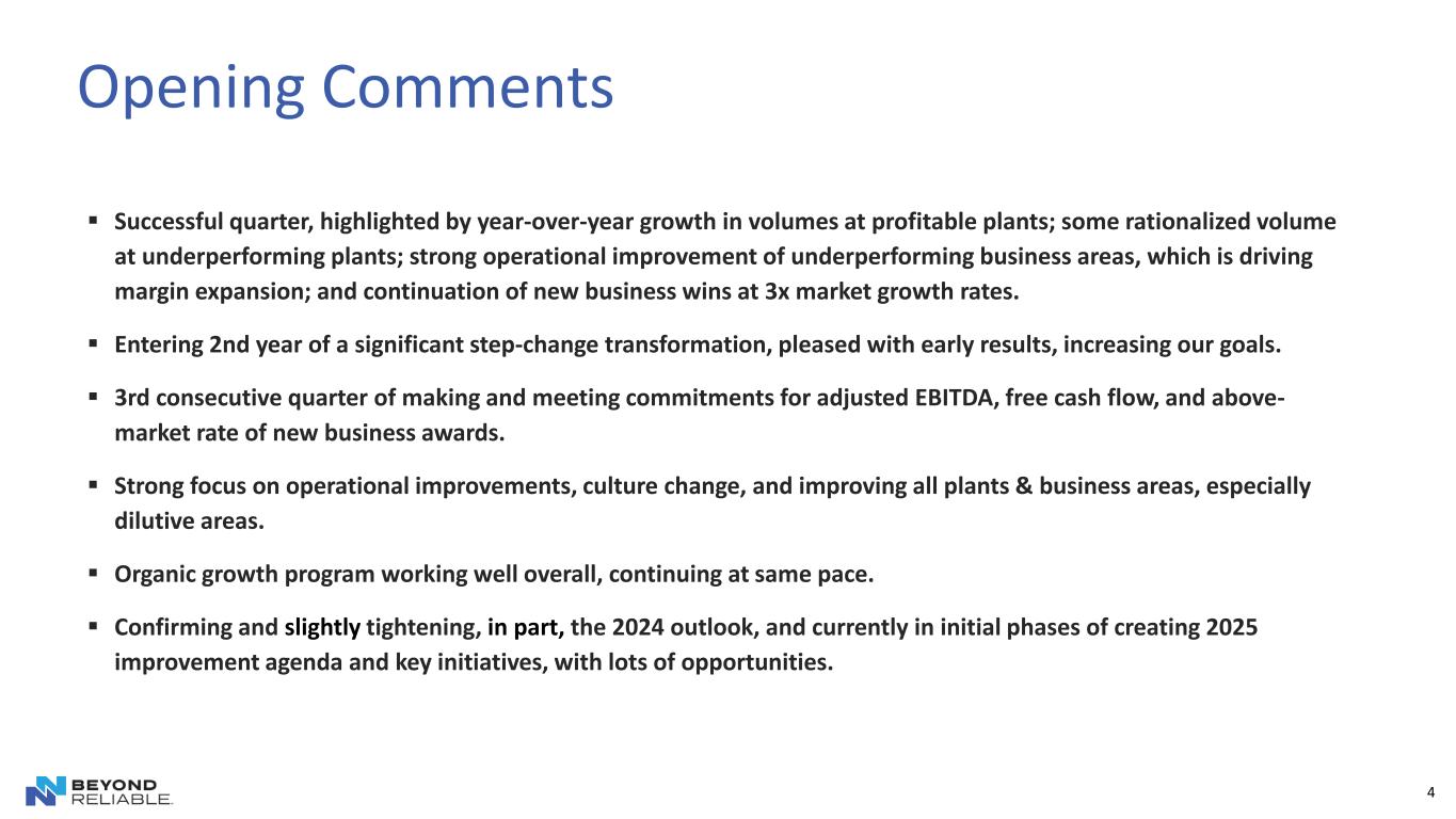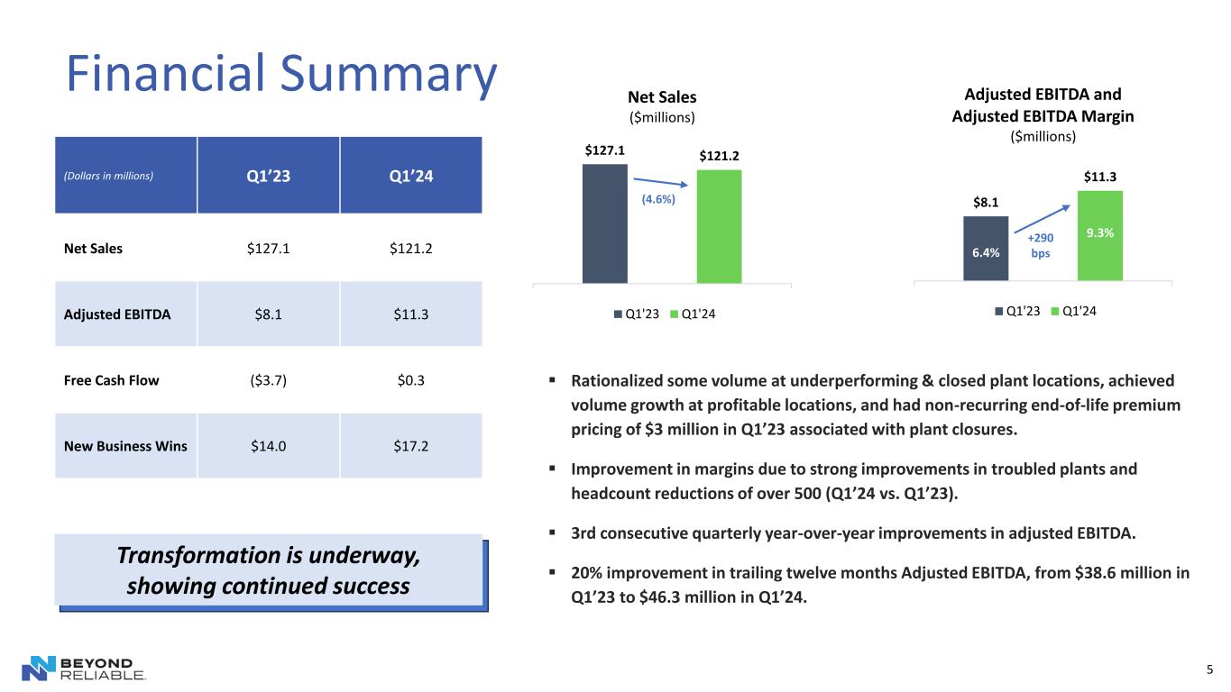 4 ▪ Successful quarter, highlighted by year-over-year growth in volumes at profitable plants; some rationalized volume at underperforming plants; strong operational improvement of underperforming business areas, which is driving margin expansion; and continuation of new business wins at 3x market growth rates. ▪ Entering 2nd year of a significant step-change transformation, pleased with early results, increasing our goals. ▪ 3rd consecutive quarter of making and meeting commitments for adjusted EBITDA, free cash flow, and above- market rate of new business awards. ▪ Strong focus on operational improvements, culture change, and improving all plants & business areas, especially dilutive areas. ▪ Organic growth program working well overall, continuing at same pace. ▪ Confirming and slightly tightening, in part, the 2024 outlook, and currently in initial phases of creating 2025 improvement agenda and key initiatives, with lots of opportunities. Opening Comments