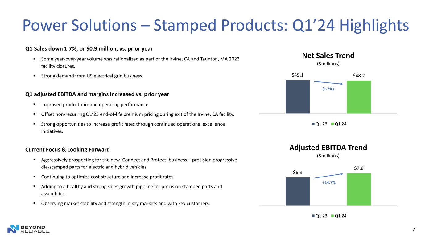 6 Sales ▪ Volume: ($4M) rationalization at underperforming plants, mostly offset by $3M growth at healthy plants; roughly flat ▪ Pricing: ~($3M) Q1 2023 end-of-life premium pricing during the Irvine plant closure that didn’t reoccur in 2024 (Dollars in millions, except per share data) Q1’23 Q1’24 Δ Net Sales $127.1 $121.2 ($5.9) Operating Income (Loss) ($7.1) ($4.8) $2.3 Adjusted Operating Income (Loss) ($0.4) ($0.7) ($0.3) Adjusted EBITDA $8.1 $11.3 $3.2 Adjusted EBITDA Margin 6.4% 9.3% 2.9% Income (Loss) per Diluted Common Share ($0.29) ($0.34) ($0.05) Adjusted Income (Loss) per Diluted Common Share ($0.12) ($0.08) $0.04 Adjusted EBITDA ▪ ($3M) of Q1 2023 end-of-life premium pricing, more than offset through operational improvements of ~$5M and increased China performance of ~$2M Q1’24 Financial Results