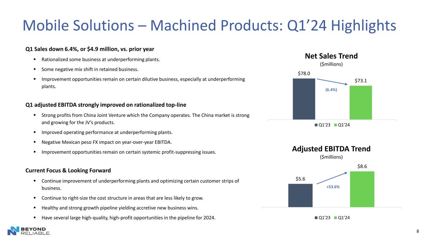 7 Q1 Sales down 1.7%, or $0.9 million, vs. prior year ▪ Some year-over-year volume was rationalized as part of the Irvine, CA and Taunton, MA 2023 facility closures. ▪ Strong demand from US electrical grid business. Q1 adjusted EBITDA and margins increased vs. prior year ▪ Improved product mix and operating performance. ▪ Offset non-recurring Q1’23 end-of-life premium pricing during exit of the Irvine, CA facility. ▪ Strong opportunities to increase profit rates through continued operational excellence initiatives. Current Focus & Looking Forward ▪ Aggressively prospecting for the new ‘Connect and Protect’ business – precision progressive die-stamped parts for electric and hybrid vehicles. ▪ Continuing to optimize cost structure and increase profit rates. ▪ Adding to a healthy and strong sales growth pipeline for precision stamped parts and assemblies. ▪ Observing market stability and strength in key markets and with key customers. Power Solutions – Stamped Products: Q1’24 Highlights $49.1 $48.2 Net Sales Trend ($millions) Q1'23 Q1'24 $6.8 $7.8 Adjusted EBITDA Trend ($millions) Q1'23 Q1'24 (1.7%) +14.7%