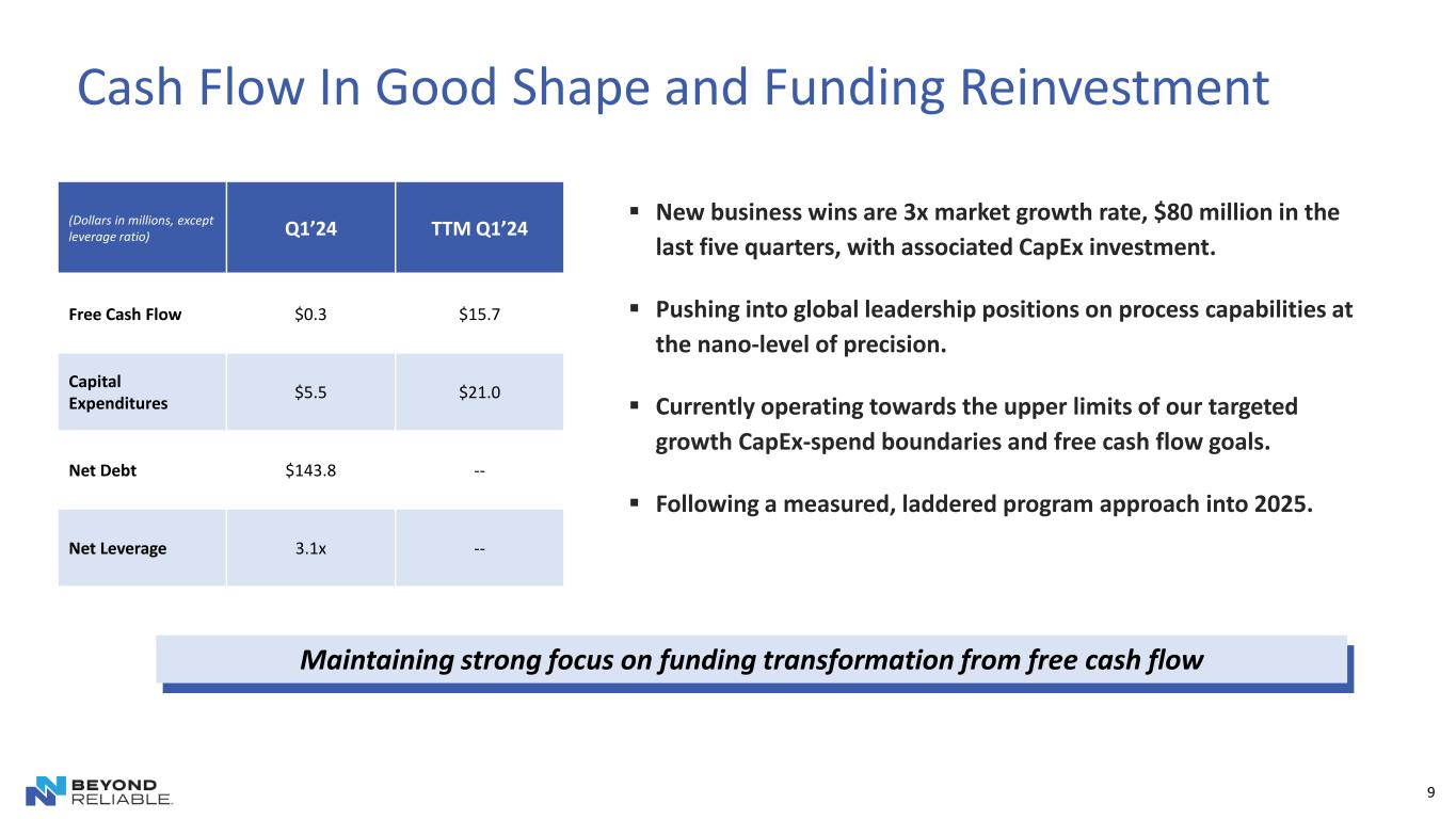 8 Q1 Sales down 6.4%, or $4.9 million, vs. prior year ▪ Rationalized some business at underperforming plants. ▪ Some negative mix shift in retained business. ▪ Improvement opportunities remain on certain dilutive business, especially at underperforming plants. Q1 adjusted EBITDA strongly improved on rationalized top-line ▪ Strong profits from China Joint Venture which the Company operates. The China market is strong and growing for the JV’s products. ▪ Improved operating performance at underperforming plants. ▪ Negative Mexican peso FX impact on year-over-year EBITDA. ▪ Improvement opportunities remain on certain systemic profit-suppressing issues. Current Focus & Looking Forward ▪ Continue improvement of underperforming plants and optimizing certain customer strips of business. ▪ Continue to right-size the cost structure in areas that are less likely to grow. ▪ Healthy and strong growth pipeline yielding accretive new business wins. ▪ Have several large high-quality, high-profit opportunities in the pipeline for 2024. Mobile Solutions – Machined Products: Q1’24 Highlights $78.0 $73.1 Net Sales Trend ($millions) Q1'23 Q1'24 $5.6 $8.6 Adjusted EBITDA Trend ($millions) Q1'23 Q1'24 (6.4%) +53.6%