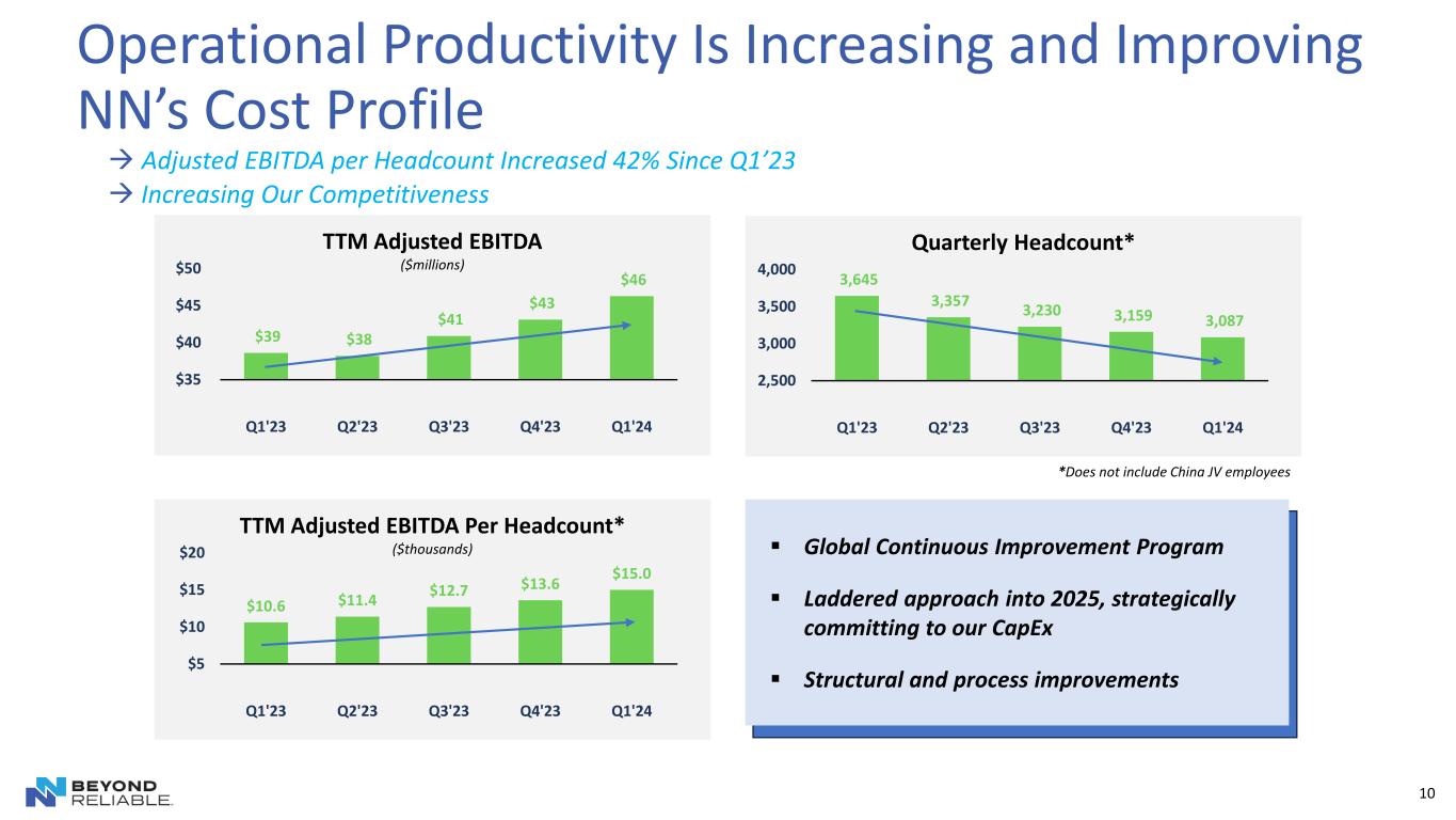 Cash Flow In Good Shape and Funding Reinvestment 9 Maintaining strong focus on funding transformation from free cash flow ▪ New business wins are 3x market growth rate, $80 million in the last five quarters, with associated CapEx investment. ▪ Pushing into global leadership positions on process capabilities at the nano-level of precision. ▪ Currently operating towards the upper limits of our targeted growth CapEx-spend boundaries and free cash flow goals. ▪ Following a measured, laddered program approach into 2025. (Dollars in millions, except leverage ratio) Q1’24 TTM Q1’24 Free Cash Flow $0.3 $15.7 Capital Expenditures $5.5 $21.0 Net Debt $143.8 -- Net Leverage 3.1x --