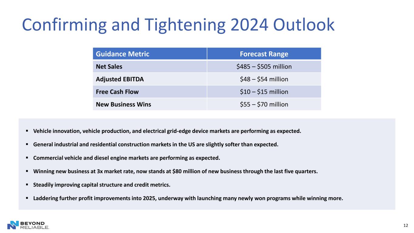 NN’s Organic Growth Program is Performing Well $14 $19 $37 $63 $80 Q1'23 Q2'23 Q3'23 Q4'23 Q1'24 Cumulative New Business Wins ($millions) 11 ▪ In 2023, NN secured $63 million of new awards through 28 programs in five countries, which will require CapEx investment. In Q1’24, NN added another $17 million of new business awards, $80 million cumulative. ▪ Operating towards the higher end of our capital allocation towards growth initiatives. NN team is focused on balancing cost improvement and growth initiatives. ▪ Growth focus areas are: China passenger vehicles; US stamped and metalized products; select vehicle programs in NA, SA, EU; and select investment in new adjacent markets including medical orthopedic products. ▪ Strong 3x above-market performance ▪ Targeting another $55 to $70 million of new business wins in 2024, on pace ▪ ~$120 to $135 million of cumulative new business wins in 2023 and 2024 Renewed focus on winning new business is driving clear results