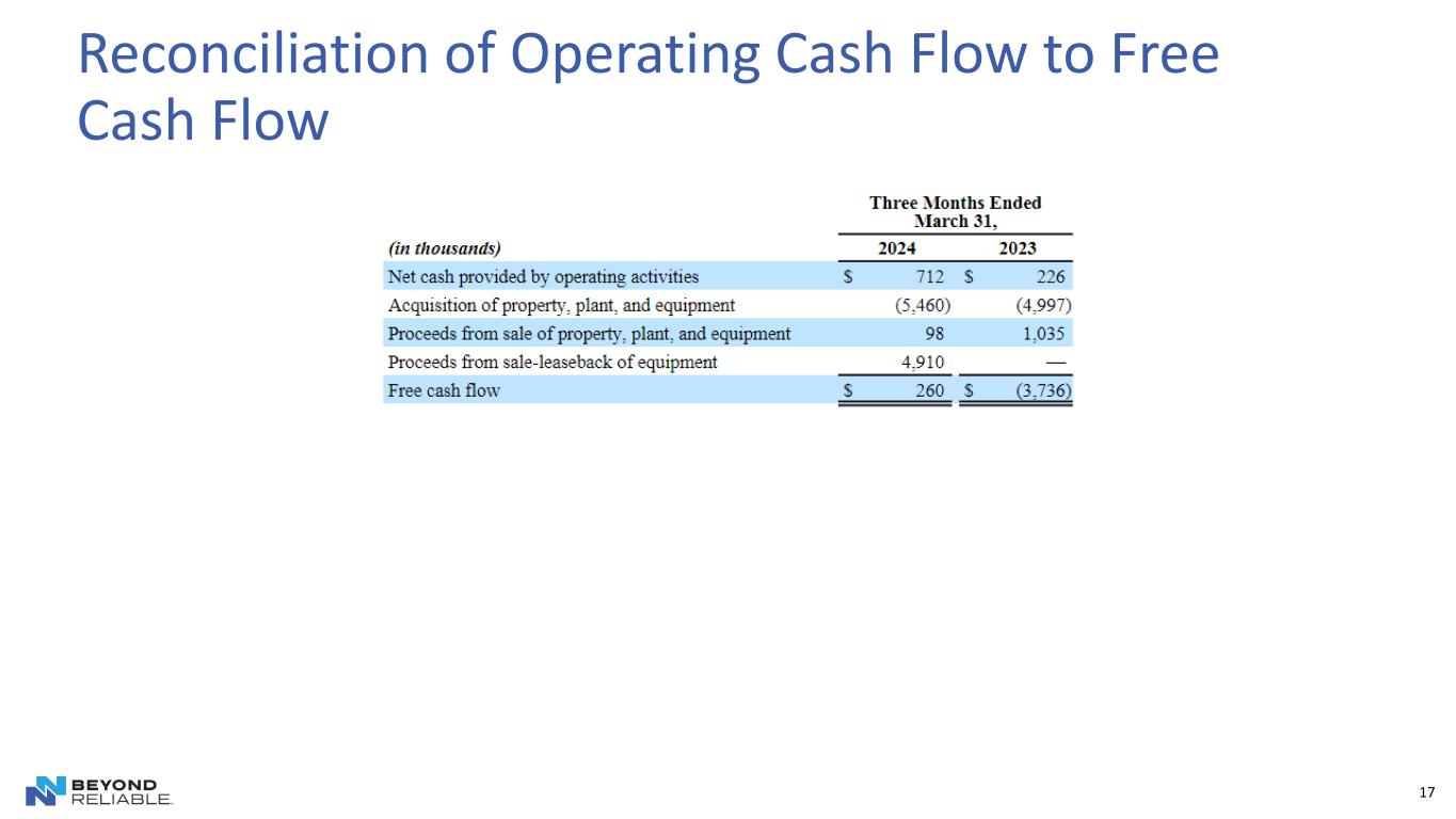 NN discloses in this press release the non-GAAP financial measures of adjusted income (loss) from operations, adjusted EBITDA, adjusted net income (loss), adjusted net income (loss) per diluted common share, and free cash flow. Each of these non-GAAP financial measures provides supplementary information about the impacts of restructuring and integration expense, acquisition and transition expenses, foreign exchange impacts on inter-company loans, amortization of intangibles and deferred financing costs, and other non-operating impacts on our business.