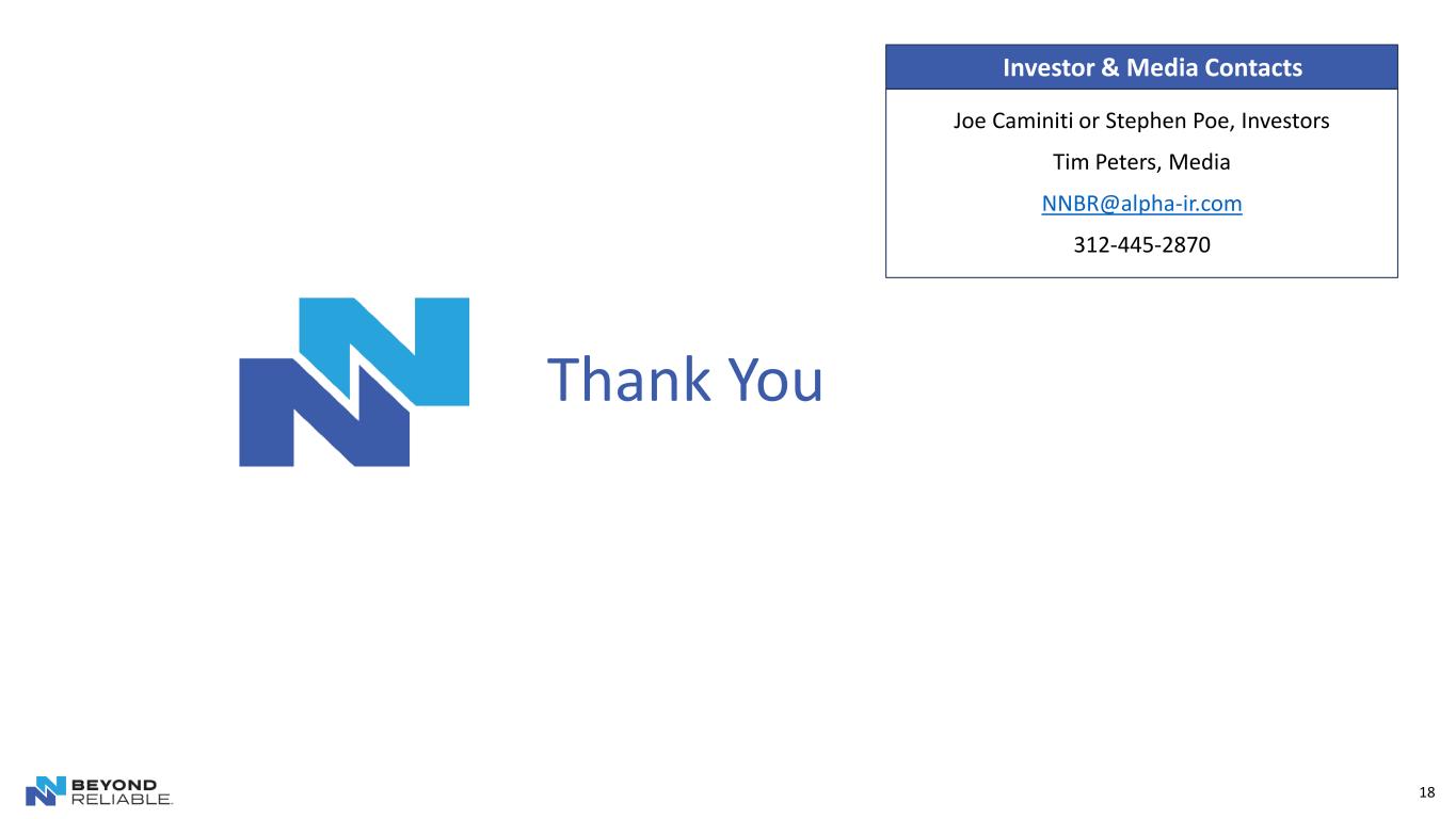 Thank You 18 Joe Caminiti or Stephen Poe, Investors Tim Peters, Media NNBR@alpha-ir.com 312-445-2870 Investor & Media Contacts