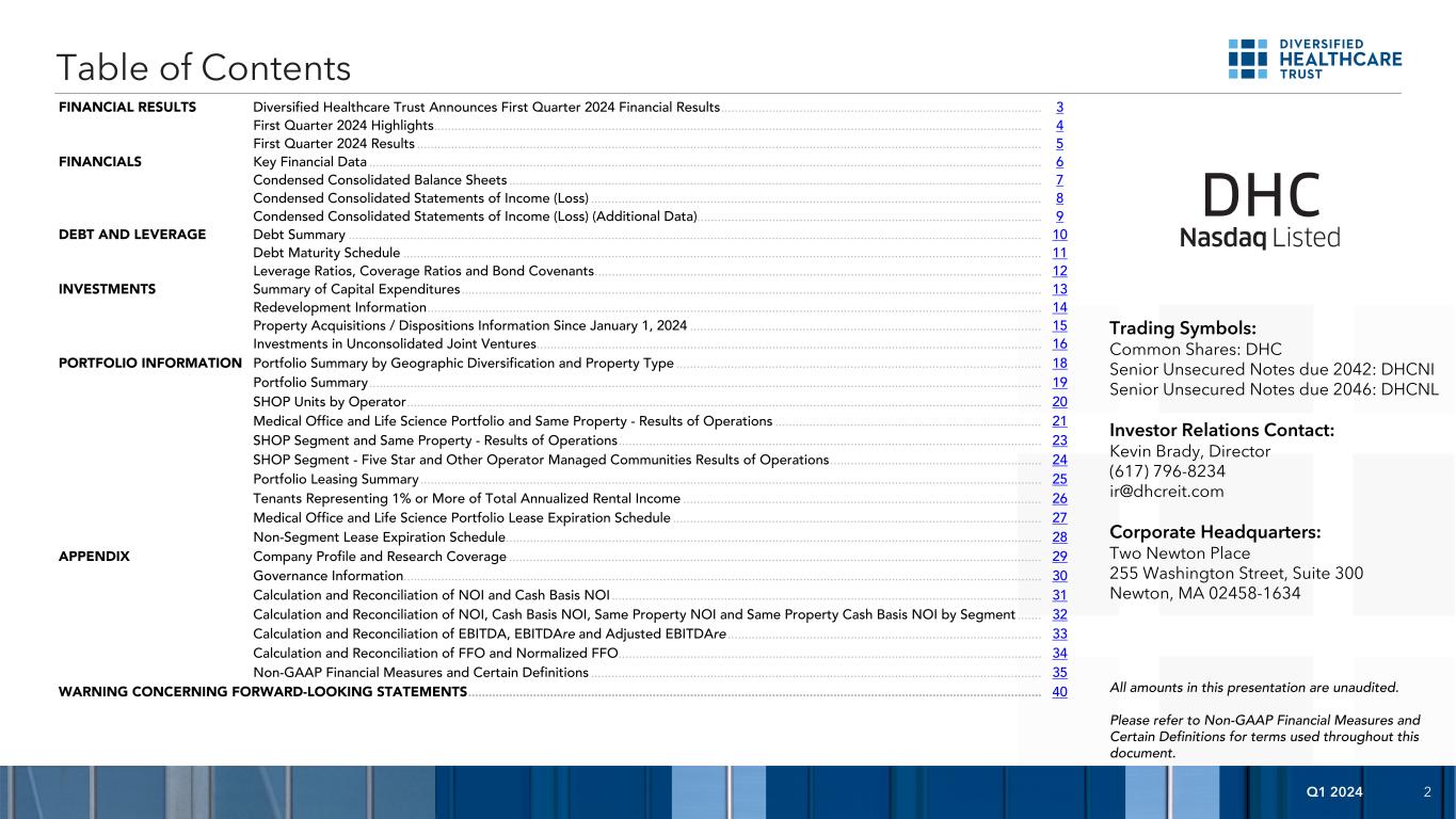 Q1 2024 2 FINANCIAL RESULTS Diversified Healthcare Trust Announces First Quarter 2024 Financial Results .............................................................................................. 3 First Quarter 2024 Highlights .................................................................................................................................................................................. 4 First Quarter 2024 Results ....................................................................................................................................................................................... 5 FINANCIALS Key Financial Data ..................................................................................................................................................................................................... 6 Condensed Consolidated Balance Sheets ............................................................................................................................................................ 7 Condensed Consolidated Statements of Income (Loss) .................................................................................................................................... 8 Condensed Consolidated Statements of Income (Loss) (Additional Data) ..................................................................................................... 9 DEBT AND LEVERAGE Debt Summary ........................................................................................................................................................................................................... 10 Debt Maturity Schedule ........................................................................................................................................................................................... 11 Leverage Ratios, Coverage Ratios and Bond Covenants ................................................................................................................................... 12 INVESTMENTS Summary of Capital Expenditures .......................................................................................................................................................................... 13 Redevelopment Information .................................................................................................................................................................................... 14 Property Acquisitions / Dispositions Information Since January 1, 2024 ....................................................................................................... 15 Investments in Unconsolidated Joint Ventures .................................................................................................................................................... 16 PORTFOLIO INFORMATION Portfolio Summary by Geographic Diversification and Property Type ........................................................................................................... 18 Portfolio Summary ..................................................................................................................................................................................................... 19 SHOP Units by Operator .......................................................................................................................................................................................... 20 Medical Office and Life Science Portfolio and Same Property - Results of Operations .............................................................................. 21 SHOP Segment and Same Property - Results of Operations ............................................................................................................................ 23 SHOP Segment - Five Star and Other Operator Managed Communities Results of Operations .............................................................. 24 Portfolio Leasing Summary ...................................................................................................................................................................................... 25 Tenants Representing 1% or More of Total Annualized Rental Income ......................................................................................................... 26 Medical Office and Life Science Portfolio Lease Expiration Schedule ............................................................................................................ 27 Non-Segment Lease Expiration Schedule ............................................................................................................................................................. 28 APPENDIX Company Profile and Research Coverage ............................................................................................................................................................ 29 Governance Information........................................................................................................................................................................................... 30 Calculation and Reconciliation of NOI and Cash Basis NOI .............................................................................................................................. 31 Calculation and Reconciliation of NOI, Cash Basis NOI, Same Property NOI and Same Property Cash Basis NOI by Segment ....... 32 Calculation and Reconciliation of EBITDA, EBITDAre and Adjusted EBITDAre ............................................................................................ 33 Calculation and Reconciliation of FFO and Normalized FFO ............................................................................................................................ 34 Non-GAAP Financial Measures and Certain Definitions ............................................................................................................