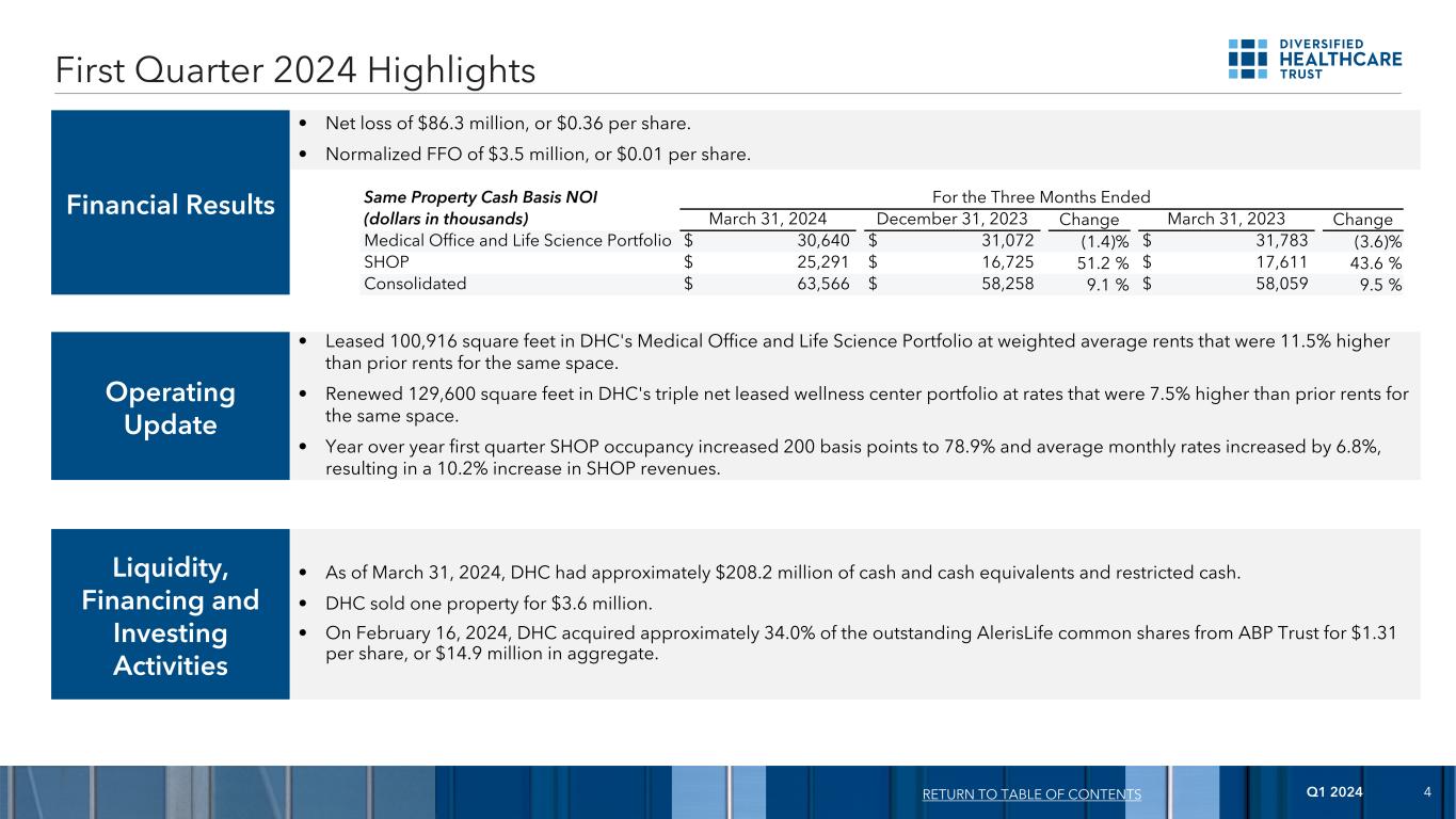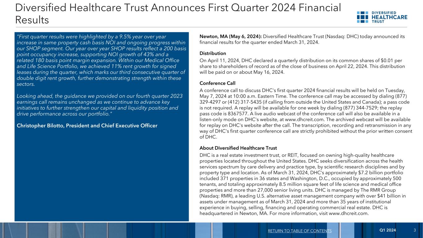 Q1 2024 3 "First quarter results were highlighted by a 9.5% year over year increase in same property cash basis NOI and ongoing progress within our SHOP segment. Our year over year SHOP results reflect a 200 basis point occupancy increase, supporting NOI growth of 43% and a related 180 basis point margin expansion. Within our Medical Office and Life Science Portfolio, we achieved 11% rent growth for signed leases during the quarter, which marks our third consecutive quarter of double digit rent growth, further demonstrating strength within these sectors. Looking ahead, the guidance we provided on our fourth quarter 2023 earnings call remains unchanged as we continue to advance key initiatives to further strengthen our capital and liquidity position and drive performance across our portfolio." Christopher Bilotto, President and Chief Executive Officer Diversified Healthcare Trust Announces First Quarter 2024 Financial Results RETURN TO TABLE OF CONTENTS Newton, MA (May 6, 2024): Diversified Healthcare Trust (Nasdaq: DHC) today announced its financial results for the quarter ended March 31, 2024. Distribution On April 11, 2024, DHC declared a quarterly distribution on its common shares of $0.01 per share to shareholders of record as of the close of business on April 22, 2024. This distribution will be paid on or about May 16, 2024. Conference Call A conference call to discuss DHC's first quarter 2024 financial results will be held on Tuesday, May 7, 2024 at 10:00 a.m. Eastern Time. The conference call may be accessed by dialing (877) 329-4297 or (412) 317-5435 (if calling from outside the United States and Canada); a pass code is not required. A replay will be available for one week by dialing (877) 344-7529; the replay pass code is 8367577. A live audio webcast of the conference call will also be available in a listen-only mode on DHC's website, at www.dhcreit.com. The archived webcast will be available for replay on DHC's website after the call. The transcription, recording and retransmission in any way of DHC's first quarter conference call are strictly prohibited without the prior written consent of DHC. About Diversified Healthcare Trust DHC is a real estate investment trust, or REIT, focused on owning high-quality healthcare properties located throughout the United States. DHC seeks diversification across the health services spectrum by care delivery and practice type, by scientific research disciplines and by property type and location. As of March 31, 2024, DHC’s approximately $7.2 billion portfolio included 371 properties in 36 states and Washington, D.C., occupied by approximately 500 tenants, and totaling approximately 8.5 million square feet of life science and medical office properties and more than 27,000 senior living units. DHC is managed by The RMR Group (Nasdaq: RMR), a leading U.S. alternative asset management company with over $41 billion in assets under management as of March 31, 2024 and more than 35 years of institutional experience in buying, selling, financing and operating commercial real estate. DHC is headquartered in Newton, MA. For more information, visit www.dhcreit.com.