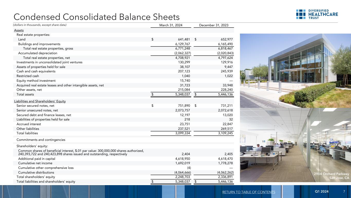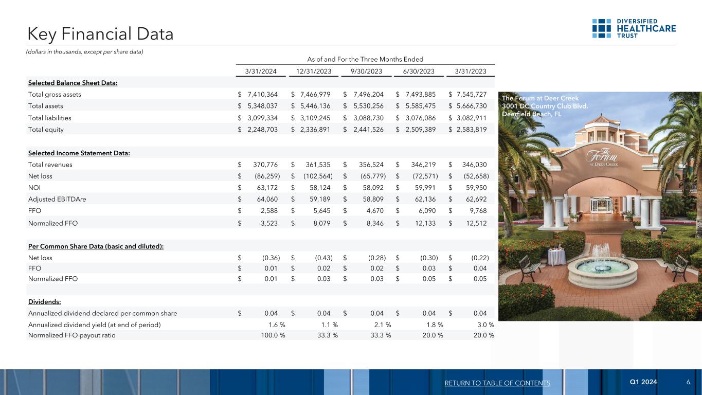 Q1 2024 6 Key Financial Data RETURN TO TABLE OF CONTENTS As of and For the Three Months Ended 3/31/2024 12/31/2023 9/30/2023 6/30/2023 3/31/2023 Selected Balance Sheet Data: Total gross assets $ 7,410,364 $ 7,466,979 $ 7,496,204 $ 7,493,885 $ 7,545,727 Total assets $ 5,348,037 $ 5,446,136 $ 5,530,256 $ 5,585,475 $ 5,666,730 Total liabilities $ 3,099,334 $ 3,109,245 $ 3,088,730 $ 3,076,086 $ 3,082,911 Total equity $ 2,248,703 $ 2,336,891 $ 2,441,526 $ 2,509,389 $ 2,583,819 Selected Income Statement Data: Total revenues $ 370,776 $ 361,535 $ 356,524 $ 346,219 $ 346,030 Net loss $ (86,259) $ (102,564) $ (65,779) $ (72,571) $ (52,658) NOI $ 63,172 $ 58,124 $ 58,092 $ 59,991 $ 59,950 Adjusted EBITDAre $ 64,060 $ 59,189 $ 58,809 $ 62,136 $ 62,692 FFO $ 2,588 $ 5,645 $ 4,670 $ 6,090 $ 9,768 Normalized FFO $ 3,523 $ 8,079 $ 8,346 $ 12,133 $ 12,512 Per Common Share Data (basic and diluted): Net loss $ (0.36) $ (0.43) $ (0.28) $ (0.30) $ (0.22) FFO $ 0.01 $ 0.02 $ 0.02 $ 0.03 $ 0.04 Normalized FFO $ 0.01 $ 0.03 $ 0.03 $ 0.05 $ 0.05 Dividends: Annualized dividend declared per common share $ 0.04 $ 0.04 $ 0.04 $ 0.04 $ 0.04 Annualized dividend yield (at end of period) 1.6 % 1.1 % 2.1 % 1.8 % 3.0 % Normalized FFO payout ratio 100.0 % 33.3 % 33.3 % 20.0 % 20.0 % (dollars in thousands, except per share data) The Forum at Deer Creek 3001 DC Country Club Blvd. Deerfield Beach, FL