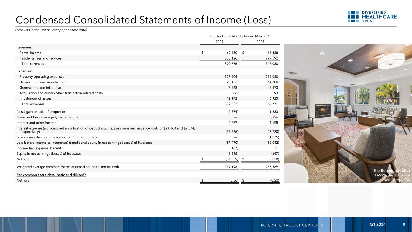 Q1 2024 8 For the Three Months Ended March 31, 2024 2023 Revenues: Rental income $ 62,650 $ 66,438 Residents fees and services 308,126 279,592 Total revenues 370,776 346,030 Expenses: Property operating expenses 307,604 286,080 Depreciation and amortization 70,133 64,800 General and administrative 7,568 5,873 Acquisition and certain other transaction related costs 86 93 Impairment of assets 12,142 5,925 Total expenses 397,533 362,771 (Loss) gain on sale of properties (5,874) 1,233 Gains and losses on equity securities, net — 8,126 Interest and other income 2,237 4,195 Interest expense (including net amortization of debt discounts, premiums and issuance costs of $24,863 and $2,074, respectively) (57,576) (47,780) Loss on modification or early extinguishment of debt — (1,075) Loss before income tax (expense) benefit and equity in net earnings (losses) of investees (87,970) (52,042) Income tax (expense) benefit (187) 31 Equity in net earnings (losses) of investees 1,898 (647) Net loss $ (86,259) $ (52,658) Weighted average common shares outstanding (basic and diluted) 239,193 238,589 Per common share data (basic and diluted): Net loss $ (0.36) $ (0.22) Condensed Consolidated Statements of Income (Loss) RETURN TO TABLE OF CONTENTS (amounts in thousands, except per share data) The Remington Club 16925 Hierba Drive San Diego, CA