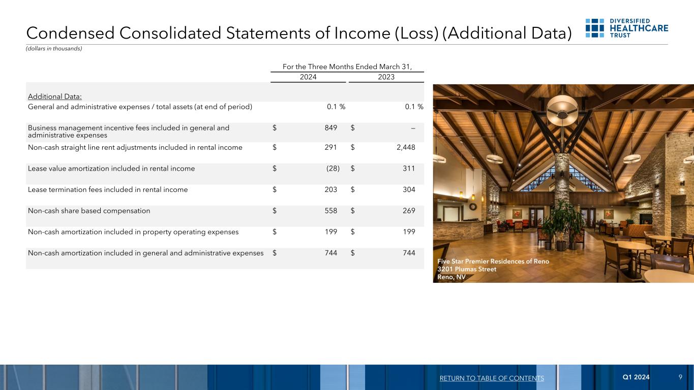 Q1 2024 9 For the Three Months Ended March 31, 2024 2023 Additional Data: General and administrative expenses / total assets (at end of period) 0.1 % 0.1 % Business management incentive fees included in general and administrative expenses $ 849 $ — Non-cash straight line rent adjustments included in rental income $ 291 $ 2,448 Lease value amortization included in rental income $ (28) $ 311 Lease termination fees included in rental income $ 203 $ 304 Non-cash share based compensation $ 558 $ 269 Non-cash amortization included in property operating expenses $ 199 $ 199 Non-cash amortization included in general and administrative expenses $ 744 $ 744 Condensed Consolidated Statements of Income (Loss) (Additional Data) (dollars in thousands) RETURN TO TABLE OF CONTENTS Five Star Premier Residences of Reno 3201 Plumas Street Reno, NV