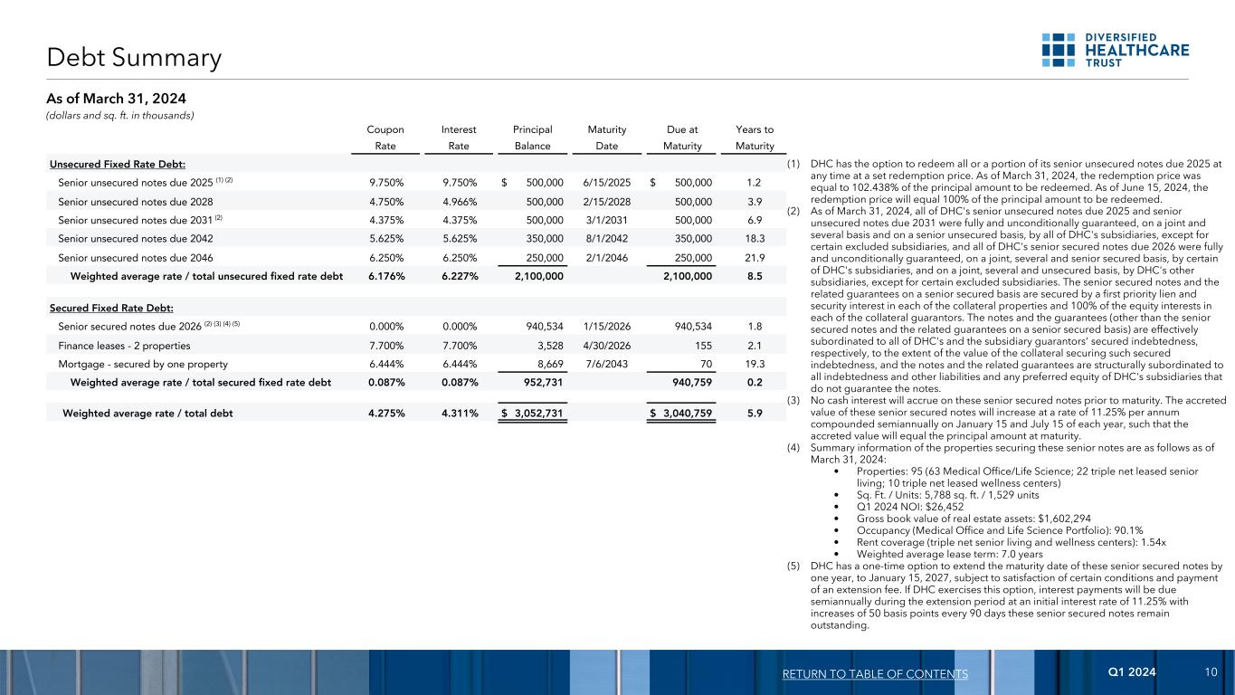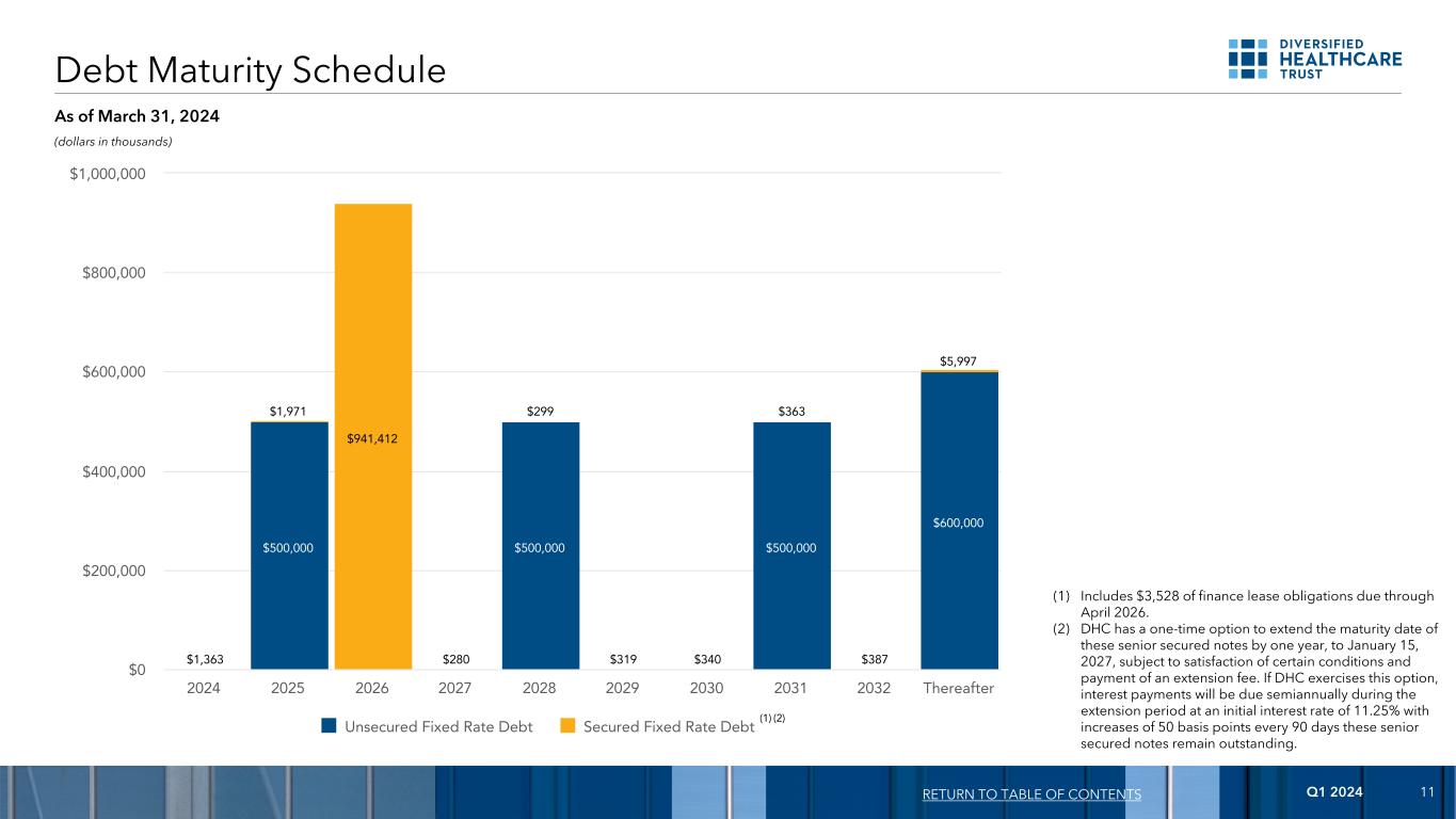 Q1 2024 10 Coupon Interest Principal Maturity Due at Years to Rate Rate Balance Date Maturity Maturity Unsecured Fixed Rate Debt: Senior unsecured notes due 2025 (1) (2) 9.750% 9.750% $ 500,000 6/15/2025 $ 500,000 1.2 Senior unsecured notes due 2028 4.750% 4.966% 500,000 2/15/2028 500,000 3.9 Senior unsecured notes due 2031 (2) 4.375% 4.375% 500,000 3/1/2031 500,000 6.9 Senior unsecured notes due 2042 5.625% 5.625% 350,000 8/1/2042 350,000 18.3 Senior unsecured notes due 2046 6.250% 6.250% 250,000 2/1/2046 250,000 21.9 Weighted average rate / total unsecured fixed rate debt 6.176% 6.227% 2,100,000 2,100,000 8.5 Secured Fixed Rate Debt: Senior secured notes due 2026 (2) (3) (4) (5) 0.000% 0.000% 940,534 1/15/2026 940,534 1.8 Finance leases - 2 properties 7.700% 7.700% 3,528 4/30/2026 155 2.1 Mortgage - secured by one property 6.444% 6.444% 8,669 7/6/2043 70 19.3 Weighted average rate / total secured fixed rate debt 0.087% 0.087% 952,731 940,759 0.2 Weighted average rate / total debt 4.275% 4.311% $ 3,052,731 $ 3,040,759 5.9 Debt Summary (dollars and sq. ft. in thousands) RETURN TO TABLE OF CONTENTS As of March 31, 2024 (1) DHC has the option to redeem all or a portion of its senior unsecured notes due 2025 at any time at a set redemption price. As of March 31, 2024, the redemption price was equal to 102.438% of the principal amount to be redeemed. As of June 15, 2024, the redemption price will equal 100% of the principal amount to be redeemed. (2) As of March 31, 2024, all of DHC's senior unsecured notes due 2025 and senior unsecured notes due 2031 were fully and unconditionally guaranteed, on a joint and several basis and on a senior unsecured basis, by all of DHC's subsidiaries, except for certain excluded subsidiaries, and all of DHC's senior secured notes due 2026 were fully and unconditionally guaranteed, on a joint, several and senior secured basis, by certain of DHC's subsidiaries, and on a joint, several and unsecured basis, by DHC's other subsidiaries, except for certain excluded subsidiaries. The senior secured notes and the related guarantees on a senior secured basis are secured by a first priority lien and security interest in each of the collateral properties and 100% of the equity interests in each of the collateral guarantors. The notes and the guarantees (other than the senior secured notes and the related guarantees on a senior secured basis) are effectively subordinated to all of DHC's and the subsidiary guarantors' secured indebtedness, respectively, to the extent of the value of the collateral securing such secured indebtedness, and the notes and the related guarantees are structurally subordinated to all indebtedness and other liabilities and any preferred equity of DHC's subsidiaries that do not guarantee the notes. (3) No cash interest will accrue on these senior secured notes prior to maturity. The accreted value of these senior secured notes will increase at a rate of 11.25% per annum compounded semiannually on January 15 and July 15 of each year, such that the accreted value will equal the principal amount at maturity. (4) Summary information of the properties securing these senior notes are as follows as of March 31, 2024: • Properties: 95 (63 Medical Office/Life Science; 22 triple net leased senior living; 10 triple net leased wellness centers) • Sq. Ft. / Units: 5,788 sq. ft. / 1,529 units • Q1 2024 NOI: $26,452 • Gross book value of real estate assets: $1,602,294 • Occupancy (Medical Office and Life Science Portfolio): 90.1% • Rent coverage (triple net senior living and wellness centers): 1.54x • Weighted average lease term: 7.0 years (5) DHC has a one-time option to extend the maturity date of these senior secured notes by one year, to January 15, 2027, subject to satisfaction of certain conditions and payment of an extension fee. If DHC exercises this option, interest payments will be due semiannually during the extension period at an initial interest rate of 11.25% with increases of 50 basis points every 90 days these senior secured notes remain outstanding.