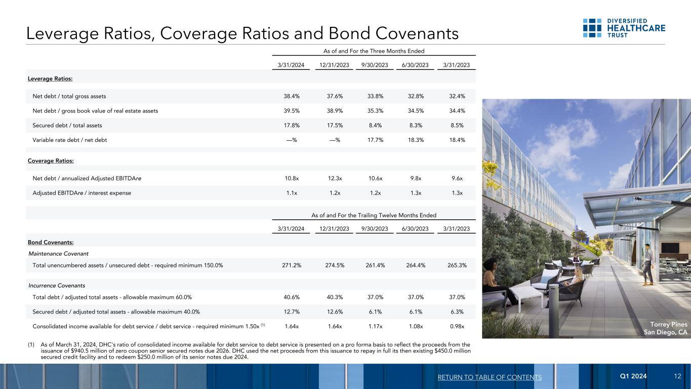 Q1 2024 12 Leverage Ratios, Coverage Ratios and Bond Covenants RETURN TO TABLE OF CONTENTS As of and For the Three Months Ended 3/31/2024 12/31/2023 9/30/2023 6/30/2023 3/31/2023 Leverage Ratios: Net debt / total gross assets 38.4% 37.6% 33.8% 32.8% 32.4% Net debt / gross book value of real estate assets 39.5% 38.9% 35.3% 34.5% 34.4% Secured debt / total assets 17.8% 17.5% 8.4% 8.3% 8.5% Variable rate debt / net debt —% —% 17.7% 18.3% 18.4% Coverage Ratios: Net debt / annualized Adjusted EBITDAre 10.8x 12.3x 10.6x 9.8x 9.6x Adjusted EBITDAre / interest expense 1.1x 1.2x 1.2x 1.3x 1.3x As of and For the Trailing Twelve Months Ended 3/31/2024 12/31/2023 9/30/2023 6/30/2023 3/31/2023 Bond Covenants: Maintenance Covenant Total unencumbered assets / unsecured debt - required minimum 150.0% 271.2% 274.5% 261.4% 264.4% 265.3% Incurrence Covenants Total debt / adjusted total assets - allowable maximum 60.0% 40.6% 40.3% 37.0% 37.0% 37.0% Secured debt / adjusted total assets - allowable maximum 40.0% 12.7% 12.6% 6.1% 6.1% 6.3% Consolidated income available for debt service / debt service - required minimum 1.50x (1) 1.64x 1.64x 1.17x 1.08x 0.98x Torrey Pines San Diego, CA (1) As of March 31, 2024, DHC's ratio of consolidated income available for debt service to debt service is presented on a pro forma basis to reflect the proceeds from the issuance of $940.5 million of zero coupon senior secured notes due 2026. DHC used the net proceeds from this issuance to repay in full its then existing $450.0 million secured credit facility and to redeem $250.0 million of its senior notes due 2024.