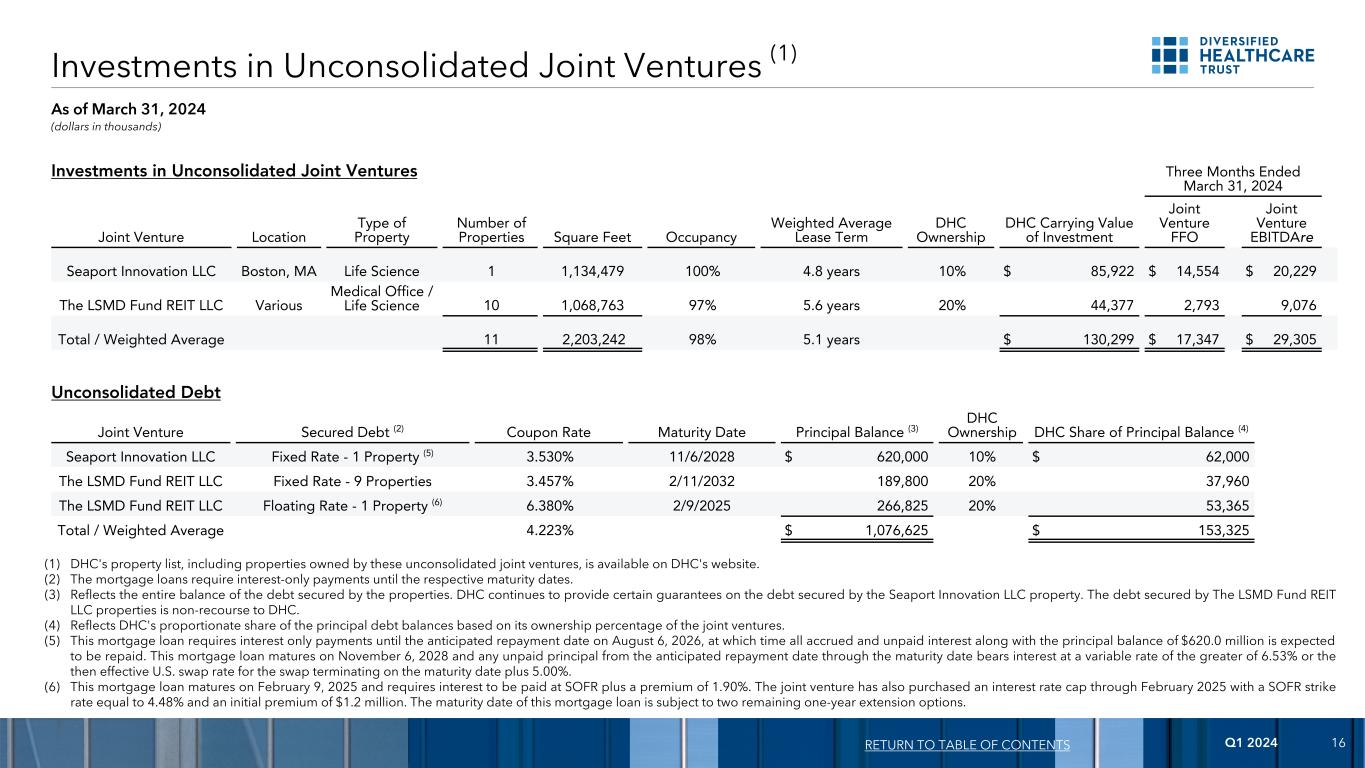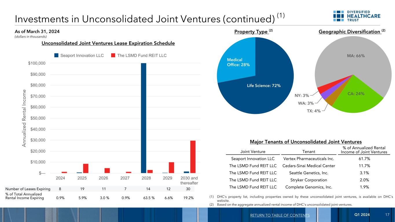 Q1 2024 16 Investments in Unconsolidated Joint Ventures (1) (dollars in thousands) RETURN TO TABLE OF CONTENTS As of March 31, 2024 Three Months Ended March 31, 2024 Joint Venture Location Type of Property Number of Properties Square Feet Occupancy Weighted Average Lease Term DHC Ownership DHC Carrying Value of Investment Joint Venture FFO Joint Venture EBITDAre Seaport Innovation LLC Boston, MA Life Science 1 1,134,479 100% 4.8 years 10% $ 85,922 $ 14,554 $ 20,229 The LSMD Fund REIT LLC Various Medical Office / Life Science 10 1,068,763 97% 5.6 years 20% 44,377 2,793 9,076 Total / Weighted Average 11 2,203,242 98% 5.1 years $ 130,299 $ 17,347 $ 29,305 Investments in Unconsolidated Joint Ventures Unconsolidated Debt Joint Venture Secured Debt (2) Coupon Rate Maturity Date Principal Balance (3) DHC Ownership DHC Share of Principal Balance (4) Seaport Innovation LLC Fixed Rate - 1 Property (5) 3.530% 11/6/2028 $ 620,000 10% $ 62,000 The LSMD Fund REIT LLC Fixed Rate - 9 Properties 3.457% 2/11/2032 189,800 20% 37,960 The LSMD Fund REIT LLC Floating Rate - 1 Property (6) 6.380% 2/9/2025 266,825 20% 53,365 Total / Weighted Average 4.223% $ 1,076,625 $ 153,325 (1) DHC's property list, including properties owned by these unconsolidated joint ventures, is available on DHC's website. (2) The mortgage loans require interest-only payments until the respective maturity dates. (3) Reflects the entire balance of the debt secured by the properties. DHC continues to provide certain guarantees on the debt secured by the Seaport Innovation LLC property. The debt secured by The LSMD Fund REIT LLC properties is non-recourse to DHC. (4) Reflects DHC's proportionate share of the principal debt balances based on its ownership percentage of the joint ventures. (5) This mortgage loan requires interest only payments until the anticipated repayment date on August 6, 2026, at which time all accrued and unpaid interest along with the principal balance of $620.0 million is expected to be repaid. This mortgage loan matures on November 6, 2028 and any unpaid principal from the anticipated repayment date through the maturity date bears interest at a variable rate of the greater of 6.53% or the then effective U.S. swap rate for the swap terminating on the maturity date plus 5.00%. (6) This mortgage loan matures on February 9, 2025 and requires interest to be paid at SOFR plus a premium of 1.90%. The joint venture has also purchased an interest rate cap through February 2025 with a SOFR strike rate equal to 4.48% and an initial premium of $1.2 million. The maturity date of this mortgage loan is subject to two remaining one-year extension options.