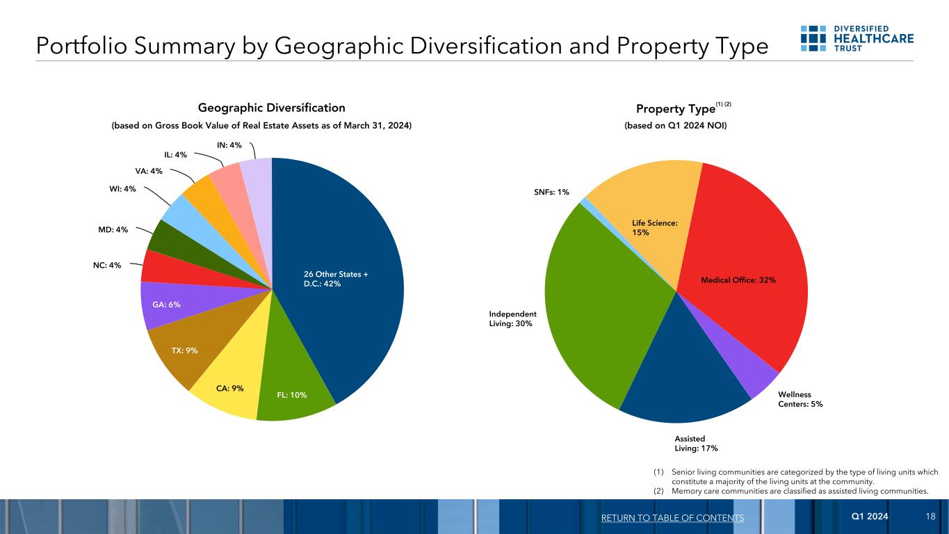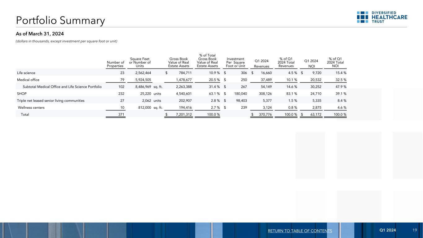 Q1 2024 18 FL: 10% CA: 9% TX: 9% GA: 6% NC: 4% MD: 4% WI: 4% VA: 4% IL: 4% IN: 4% 26 Other States + D.C.: 42% (based on Gross Book Value of Real Estate Assets as of March 31, 2024) (1) Senior living communities are categorized by the type of living units which constitute a majority of the living units at the community. (2) Memory care communities are classified as assisted living communities. Portfolio Summary by Geographic Diversification and Property Type Geographic Diversification RETURN TO TABLE OF CONTENTS Assisted Living: 17% Independent Living: 30% SNFs: 1% Life Science: 15% Medical Office: 32% Wellness Centers: 5% Property Type(1) (2) (based on Q1 2024 NOI)