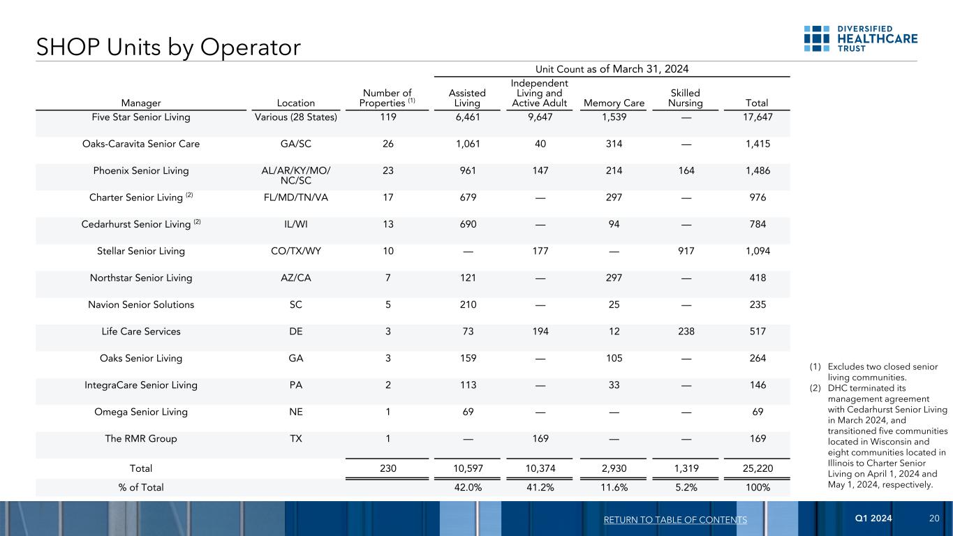 Q1 2024 20 SHOP Units by Operator RETURN TO TABLE OF CONTENTS Unit Count as of March 31, 2024 Manager Location Number of Properties (1) Assisted Living Independent Living and Active Adult Memory Care Skilled Nursing Total Five Star Senior Living Various (28 States) 119 6,461 9,647 1,539 — 17,647 Oaks-Caravita Senior Care GA/SC 26 1,061 40 314 — 1,415 Phoenix Senior Living AL/AR/KY/MO/ NC/SC 23 961 147 214 164 1,486 Charter Senior Living (2) FL/MD/TN/VA 17 679 — 297 — 976 Cedarhurst Senior Living (2) IL/WI 13 690 — 94 — 784 Stellar Senior Living CO/TX/WY 10 — 177 — 917 1,094 Northstar Senior Living AZ/CA 7 121 — 297 — 418 Navion Senior Solutions SC 5 210 — 25 — 235 Life Care Services DE 3 73 194 12 238 517 Oaks Senior Living GA 3 159 — 105 — 264 IntegraCare Senior Living PA 2 113 — 33 — 146 Omega Senior Living NE 1 69 — — — 69 The RMR Group TX 1 — 169 — — 169 Total 230 10,597 10,374 2,930 1,319 25,220 % of Total 42.0% 41.2% 11.6% 5.2% 100% (1) Excludes two closed senior living communities. (2) DHC terminated its management agreement with Cedarhurst Senior Living in March 2024, and transitioned five communities located in Wisconsin and eight communities located in Illinois to Charter Senior Living on April 1, 2024 and May 1, 2024, respectively.