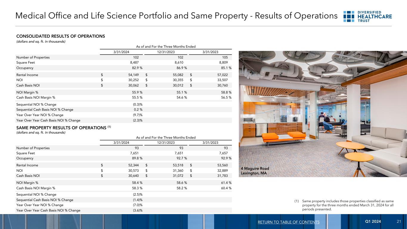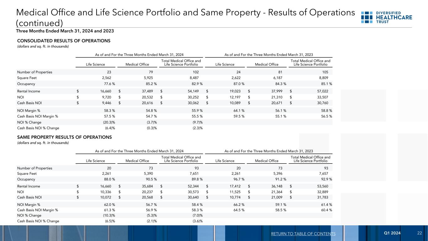 Q1 2024 21 (1) Same property includes those properties classified as same property for the three months ended March 31, 2024 for all periods presented. RETURN TO TABLE OF CONTENTS CONSOLIDATED RESULTS OF OPERATIONS (dollars and sq. ft. in thousands) As of and For the Three Months Ended 3/31/2024 12/31/2023 3/31/2023 Number of Properties 102 102 105 Square Feet 8,487 8,610 8,809 Occupancy 82.9 % 86.9 % 85.1 % Rental Income $ 54,149 $ 55,082 $ 57,022 NOI $ 30,252 $ 30,355 $ 33,507 Cash Basis NOI $ 30,062 $ 30,012 $ 30,760 NOI Margin % 55.9 % 55.1 % 58.8 % Cash Basis NOI Margin % 55.5 % 54.6 % 56.5 % Sequential NOI % Change (0.3) % Sequential Cash Basis NOI % Change 0.2 % Year Over Year NOI % Change (9.7) % Year Over Year Cash Basis NOI % Change (2.3) % SAME PROPERTY RESULTS OF OPERATIONS (1) (dollars and sq. ft. in thousands) As of and For the Three Months Ended 3/31/2024 12/31/2023 3/31/2023 Number of Properties 93 93 93 Square Feet 7,651 7,651 7,657 Occupancy 89.8 % 92.7 % 92.9 % Rental Income $ 52,344 $ 53,518 $ 53,560 NOI $ 30,573 $ 31,360 $ 32,889 Cash Basis NOI $ 30,640 $ 31,072 $ 31,783 NOI Margin % 58.4 % 58.6 % 61.4 % Cash Basis NOI Margin % 58.3 % 58.2 % 60.4 % Sequential NOI % Change (2.5) % Sequential Cash Basis NOI % Change (1.4) % Year Over Year NOI % Change (7.0) % Year Over Year Cash Basis NOI % Change (3.6) % Medical Office and Life Science Portfolio and Same Property - Results of Operations 4 Maguire Road Lexington, MA