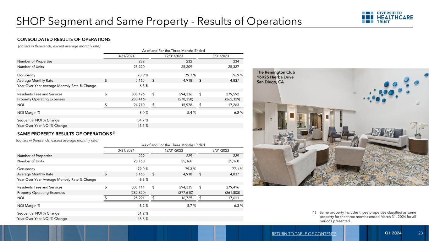 Q1 2024 23 SHOP Segment and Same Property - Results of Operations RETURN TO TABLE OF CONTENTS CONSOLIDATED RESULTS OF OPERATIONS As of and For the Three Months Ended 3/31/2024 12/31/2023 3/31/2023 Number of Properties 232 232 234 Number of Units 25,220 25,209 25,327 Occupancy 78.9 % 79.3 % 76.9 % Average Monthly Rate $ 5,165 $ 4,918 $ 4,837 Year Over Year Average Monthly Rate % Change 6.8 % Residents Fees and Services $ 308,126 $ 294,336 $ 279,592 Property Operating Expenses (283,416) (278,358) (262,329) NOI $ 24,710 $ 15,978 $ 17,263 NOI Margin % 8.0 % 5.4 % 6.2 % Sequential NOI % Change 54.7 % Year Over Year NOI % Change 43.1 % SAME PROPERTY RESULTS OF OPERATIONS (1) As of and For the Three Months Ended 3/31/2024 12/31/2023 3/31/2023 Number of Properties 229 229 229 Number of Units 25,160 25,160 25,160 Occupancy 79.0 % 79.3 % 77.1 % Average Monthly Rate $ 5,165 $ 4,918 $ 4,837 Year Over Year Average Monthly Rate % Change 6.8 % Residents Fees and Services $ 308,111 $ 294,335 $ 279,416 Property Operating Expenses (282,820) (277,610) (261,805) NOI $ 25,291 $ 16,725 $ 17,611 NOI Margin % 8.2 % 5.7 % 6.3 % Sequential NOI % Change 51.2 % Year Over Year NOI % Change 43.6 % (1) Same property includes those properties classified as same property for the three months ended March 31, 2024 for all periods presented. (dollars in thousands, except average monthly rate) (dollars in thousands, except average monthly rate) The Remington Club 16925 Hierba Drive San Diego, CA