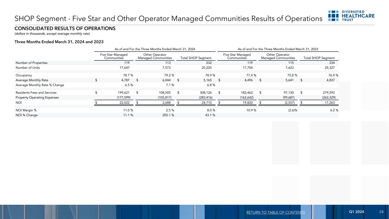 Q1 2024 24RETURN TO TABLE OF CONTENTS As of and For the Three Months Ended March 31, 2024 As of and For the Three Months Ended March 31, 2023 Five Star Managed Communities Other Operator Managed Communities Total SHOP Segment Five Star Managed Communities Other Operator Managed Communities Total SHOP Segment Number of Properties 119 113 232 119 115 234 Number of Units 17,647 7,573 25,220 17,704 7,623 25,327 Occupancy 78.7 % 79.2 % 78.9 % 77.4 % 75.8 % 76.9 % Average Monthly Rate $ 4,787 $ 6,044 $ 5,165 $ 4,496 $ 5,641 $ 4,837 Average Monthly Rate % Change 6.5 % 7.1 % 6.8 % Residents Fees and Services $ 199,621 $ 108,505 $ 308,126 $ 182,462 $ 97,130 $ 279,592 Property Operating Expenses (177,599) (105,817) (283,416) (162,642) (99,687) (262,329) NOI $ 22,022 $ 2,688 $ 24,710 $ 19,820 $ (2,557) $ 17,263 NOI Margin % 11.0 % 2.5 % 8.0 % 10.9 % (2.6) % 6.2 % NOI % Change 11.1 % 205.1 % 43.1 % SHOP Segment - Five Star and Other Operator Managed Communities Results of Operations Three Months Ended March 31, 2024 and 2023 CONSOLIDATED RESULTS OF OPERATIONS (dollars in thousands, except average monthly rate)