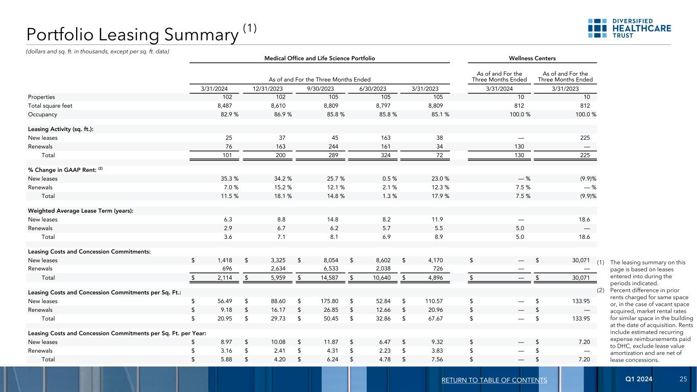 Q1 2024 25 Portfolio Leasing Summary (1) (1) The leasing summary on this page is based on leases entered into during the periods indicated. (2) Percent difference in prior rents charged for same space or, in the case of vacant space acquired, market rental rates for similar space in the building at the date of acquisition. Rents include estimated recurring expense reimbursements paid to DHC, exclude lease value amortization and are net of lease concessions. RETURN TO TABLE OF CONTENTS Medical Office and Life Science Portfolio Wellness Centers As of and For the Three Months Ended As of and For the Three Months Ended As of and For the Three Months Ended 3/31/2024 12/31/2023 9/30/2023 6/30/2023 3/31/2023 3/31/2024 3/31/2023 Properties 102 102 105 105 105 10 10 Total square feet 8,487 8,610 8,809 8,797 8,809 812 812 Occupancy 82.9 % 86.9 % 85.8 % 85.8 % 85.1 % 100.0 % 100.0 % Leasing Activity (sq. ft.): New leases 25 37 45 163 38 — 225 Renewals 76 163 244 161 34 130 — Total 101 200 289 324 72 130 225 % Change in GAAP Rent: (2) New leases 35.3 % 34.2 % 25.7 % 0.5 % 23.0 % — % (9.9) % Renewals 7.0 % 15.2 % 12.1 % 2.1 % 12.3 % 7.5 % — % Total 11.5 % 18.1 % 14.8 % 1.3 % 17.9 % 7.5 % (9.9) % Weighted Average Lease Term (years): New leases 6.3 8.8 14.8 8.2 11.9 — 18.6 Renewals 2.9 6.7 6.2 5.7 5.5 5.0 — Total 3.6 7.1 8.1 6.9 8.9 5.0 18.6 Leasing Costs and Concession Commitments: New leases $ 1,418 $ 3,325 $ 8,054 $ 8,602 $ 4,170 $ — $ 30,071 Renewals 696 2,634 6,533 2,038 726 — — Total $ 2,114 $ 5,959 $ 14,587 $ 10,640 $ 4,896 $ — $ 30,071 Leasing Costs and Concession Commitments per Sq. Ft.: New leases $ 56.49 $ 88.60 $ 175.80 $ 52.84 $ 110.57 $ — $ 133.95 Renewals $ 9.18 $ 16.17 $ 26.85 $ 12.66 $ 20.96 $ — $ — Total $ 20.95 $ 29.73 $ 50.45 $ 32.86 $ 67.67 $ — $ 133.95 Leasing Costs and Concession Commitments per Sq. Ft. per Year: New leases $ 8.97 $ 10.08 $ 11.87 $ 6.47 $ 9.32 $ — $ 7.20 Renewals $ 3.16 $ 2.41 $ 4.31 $ 2.23 $ 3.83 $ — $ — Total $ 5.88 $ 4.20 $ 6.24 $ 4.78 $ 7.56 $ — $ 7.20 (dollars and sq. ft. in thousands, except per sq. ft. data)