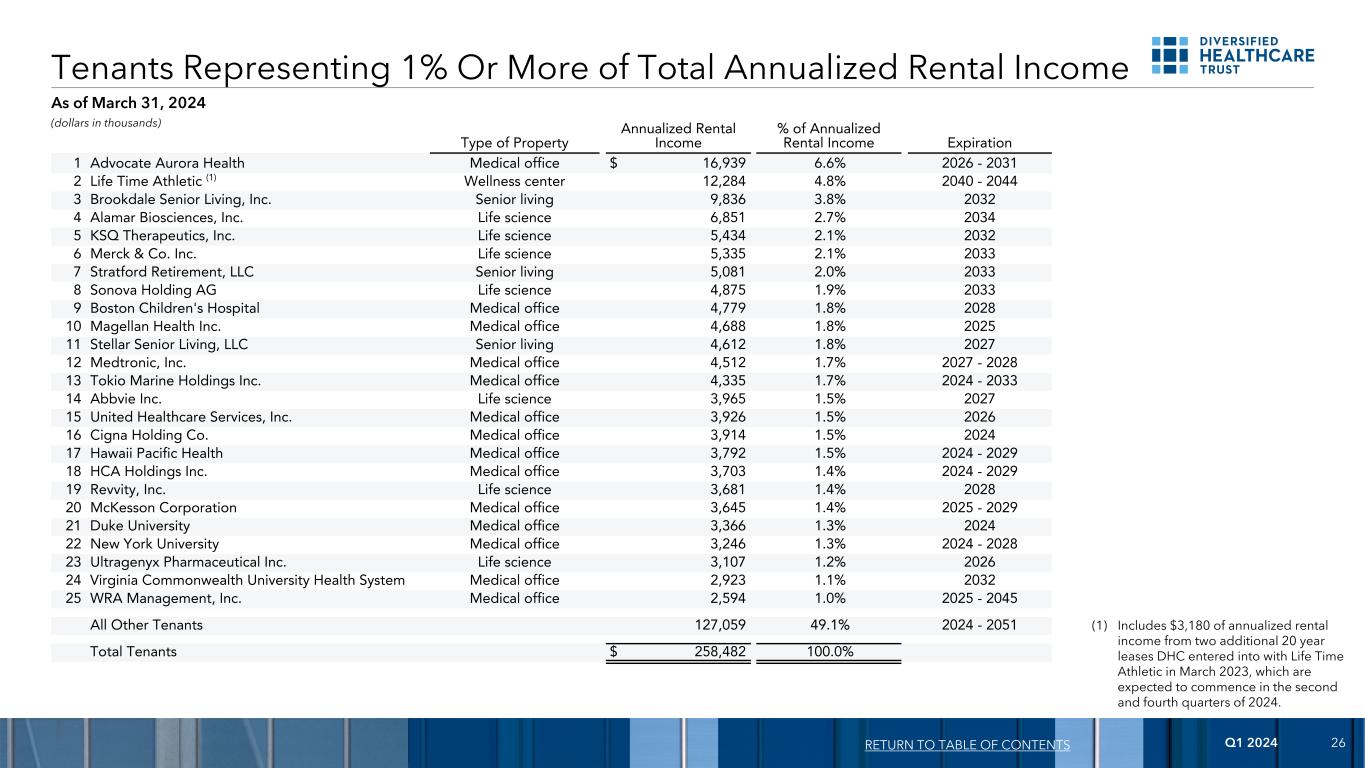 Q1 2024 26 As of March 31, 2024 Tenants Representing 1% Or More of Total Annualized Rental Income RETURN TO TABLE OF CONTENTS (dollars in thousands) Type of Property Annualized Rental Income % of Annualized Rental Income Expiration 1 Advocate Aurora Health Medical office $ 16,939 6.6% 2026 - 2031 2 Life Time Athletic (1) Wellness center 12,284 4.8% 2040 - 2044 3 Brookdale Senior Living, Inc. Senior living 9,836 3.8% 2032 4 Alamar Biosciences, Inc. Life science 6,851 2.7% 2034 5 KSQ Therapeutics, Inc. Life science 5,434 2.1% 2032 6 Merck & Co. Inc. Life science 5,335 2.1% 2033 7 Stratford Retirement, LLC Senior living 5,081 2.0% 2033 8 Sonova Holding AG Life science 4,875 1.9% 2033 9 Boston Children's Hospital Medical office 4,779 1.8% 2028 10 Magellan Health Inc. Medical office 4,688 1.8% 2025 11 Stellar Senior Living, LLC Senior living 4,612 1.8% 2027 12 Medtronic, Inc. Medical office 4,512 1.7% 2027 - 2028 13 Tokio Marine Holdings Inc. Medical office 4,335 1.7% 2024 - 2033 14 Abbvie Inc. Life science 3,965 1.5% 2027 15 United Healthcare Services, Inc. Medical office 3,926 1.5% 2026 16 Cigna Holding Co. Medical office 3,914 1.5% 2024 17 Hawaii Pacific Health Medical office 3,792 1.5% 2024 - 2029 18 HCA Holdings Inc. Medical office 3,703 1.4% 2024 - 2029 19 Revvity, Inc. Life science 3,681 1.4% 2028 20 McKesson Corporation Medical office 3,645 1.4% 2025 - 2029 21 Duke University Medical office 3,366 1.3% 2024 22 New York University Medical office 3,246 1.3% 2024 - 2028 23 Ultragenyx Pharmaceutical Inc. Life science 3,107 1.2% 2026 24 Virginia Commonwealth University Health System Medical office 2,923 1.1% 2032 25 WRA Management, Inc. Medical office 2,594 1.0% 2025 - 2045 All Other Tenants 127,059 49.1% 2024 - 2051 Total Tenants $ 258,482 100.0% (1) Includes $3,180 of annualized rental income from two additional 20 year leases DHC entered into with Life Time Athletic in March 2023, which are expected to commence in the second and fourth quarters of 2024.