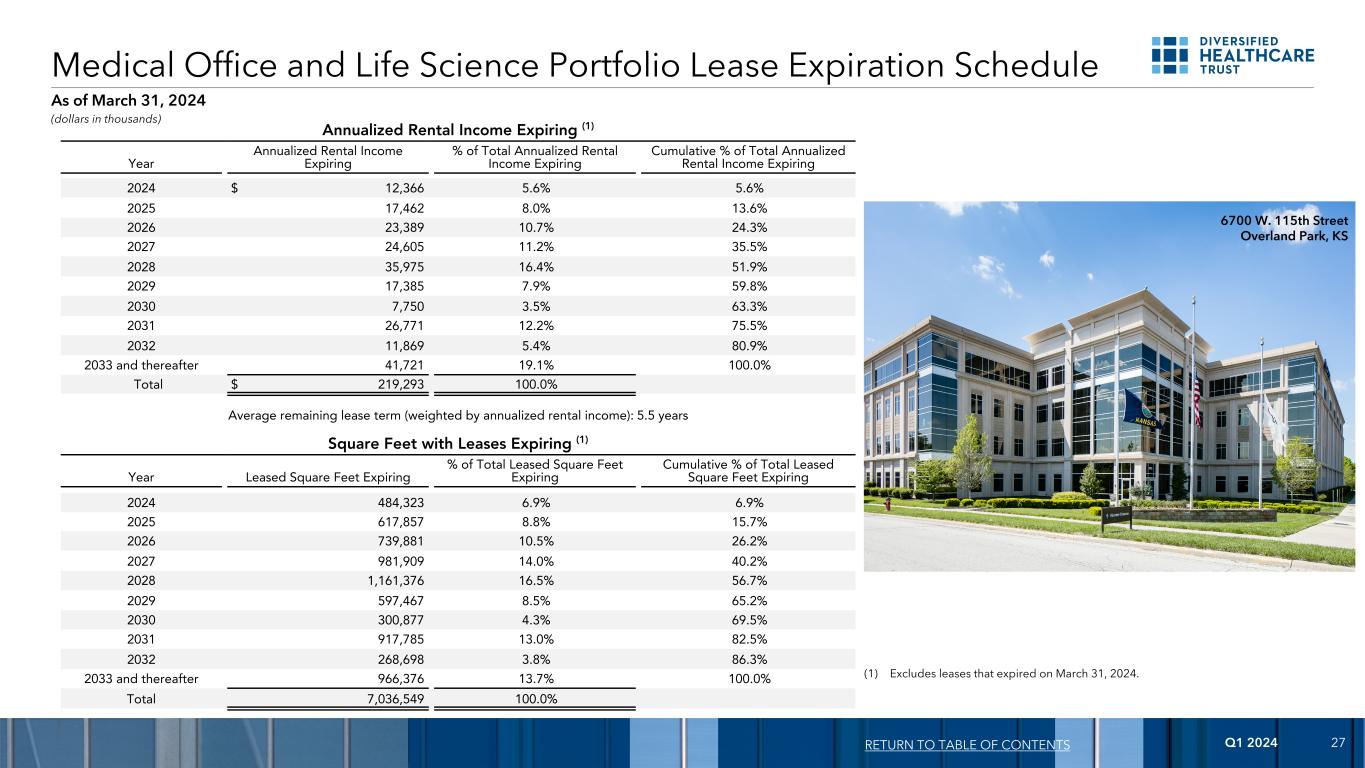 Q1 2024 27 Medical Office and Life Science Portfolio Lease Expiration Schedule RETURN TO TABLE OF CONTENTS (dollars in thousands) As of March 31, 2024 Annualized Rental Income Expiring (1) Year Annualized Rental Income Expiring % of Total Annualized Rental Income Expiring Cumulative % of Total Annualized Rental Income Expiring 2024 $ 12,366 5.6% 5.6% 2025 17,462 8.0% 13.6% 2026 23,389 10.7% 24.3% 2027 24,605 11.2% 35.5% 2028 35,975 16.4% 51.9% 2029 17,385 7.9% 59.8% 2030 7,750 3.5% 63.3% 2031 26,771 12.2% 75.5% 2032 11,869 5.4% 80.9% 2033 and thereafter 41,721 19.1% 100.0% Total $ 219,293 100.0% Average remaining lease term (weighted by annualized rental income): 5.5 years Square Feet with Leases Expiring (1) Year Leased Square Feet Expiring % of Total Leased Square Feet Expiring Cumulative % of Total Leased Square Feet Expiring 2024 484,323 6.9% 6.9% 2025 617,857 8.8% 15.7% 2026 739,881 10.5% 26.2% 2027 981,909 14.0% 40.2% 2028 1,161,376 16.5% 56.7% 2029 597,467 8.5% 65.2% 2030 300,877 4.3% 69.5% 2031 917,785 13.0% 82.5% 2032 268,698 3.8% 86.3% 2033 and thereafter 966,376 13.7% 100.0% Total 7,036,549 100.0% 6700 W. 115th Street Overland Park, KS (1) Excludes leases that expired on March 31, 2024.