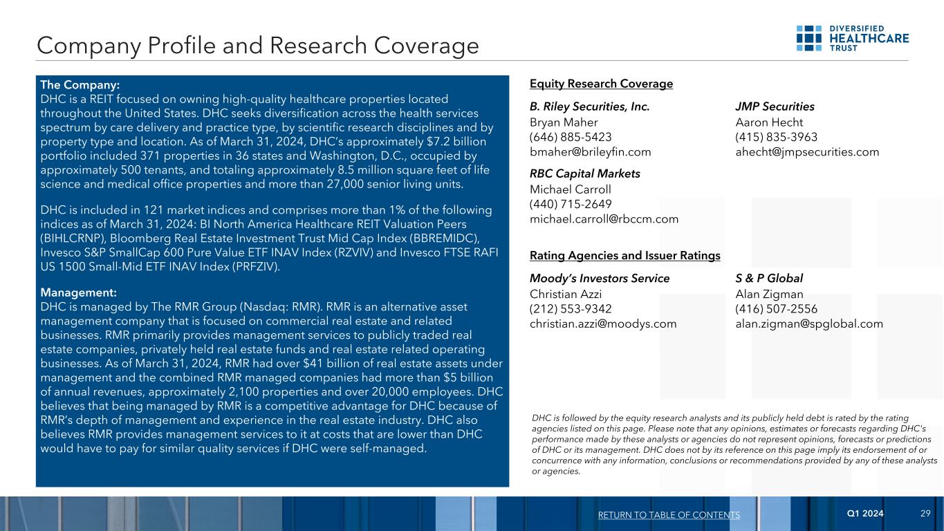 Q1 2024 29 The Company: DHC is a REIT focused on owning high-quality healthcare properties located throughout the United States. DHC seeks diversification across the health services spectrum by care delivery and practice type, by scientific research disciplines and by property type and location. As of March 31, 2024, DHC’s approximately $7.2 billion portfolio included 371 properties in 36 states and Washington, D.C., occupied by approximately 500 tenants, and totaling approximately 8.5 million square feet of life science and medical office properties and more than 27,000 senior living units. DHC is included in 121 market indices and comprises more than 1% of the following indices as of March 31, 2024: BI North America Healthcare REIT Valuation Peers (BIHLCRNP), Bloomberg Real Estate Investment Trust Mid Cap Index (BBREMIDC), Invesco S&P SmallCap 600 Pure Value ETF INAV Index (RZVIV) and Invesco FTSE RAFI US 1500 Small-Mid ETF INAV Index (PRFZIV). Management: DHC is managed by The RMR Group (Nasdaq: RMR). RMR is an alternative asset management company that is focused on commercial real estate and related businesses. RMR primarily provides management services to publicly traded real estate companies, privately held real estate funds and real estate related operating businesses. As of March 31, 2024, RMR had over $41 billion of real estate assets under management and the combined RMR managed companies had more than $5 billion of annual revenues, approximately 2,100 properties and over 20,000 employees. DHC believes that being managed by RMR is a competitive advantage for DHC because of RMR’s depth of management and experience in the real estate industry. DHC also believes RMR provides management services to it at costs that are lower than DHC would have to pay for similar quality services if DHC were self-managed. Company Profile and Research Coverage RETURN TO TABLE OF CONTENTS Equity Research Coverage B. Riley Securities, Inc. JMP Securities Bryan Maher Aaron Hecht (646) 885-5423 (415) 835-3963 bmaher@brileyfin.com ahecht@jmpsecurities.com RBC Capital Markets Michael Carroll (440) 715-2649 michael.carroll@rbccm.com Rating Agencies and Issuer Ratings Moody’s Investors Service S & P Global Christian Azzi Alan Zigman (212) 553-9342 (416) 507-2556 christian.azzi@moodys.com alan.zigman@spglobal.com DHC is followed by the equity research analysts and its publicly held debt is rated by the rating agencies listed on this page. Please note that any opinions, estimates or forecasts regarding DHC's performance made by these analysts or agencies do not represent opinions, forecasts or predictions of DHC or its management. DHC does not by its reference on this page imply its endorsement of or concurrence with any information, conclusions or recommendations provided by any of these analysts or agencies.