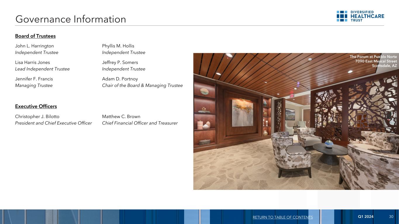 Q1 2024 30 Board of Trustees John L. Harrington Phyllis M. Hollis Independent Trustee Independent Trustee Lisa Harris Jones Jeffrey P. Somers Lead Independent Trustee Independent Trustee Jennifer F. Francis Adam D. Portnoy Managing Trustee Chair of the Board & Managing Trustee Executive Officers Christopher J. Bilotto Matthew C. Brown President and Chief Executive Officer Chief Financial Officer and Treasurer Governance Information RETURN TO TABLE OF CONTENTS The Forum at Pueblo Norte 7090 East Mescal Street Scottsdale, AZ