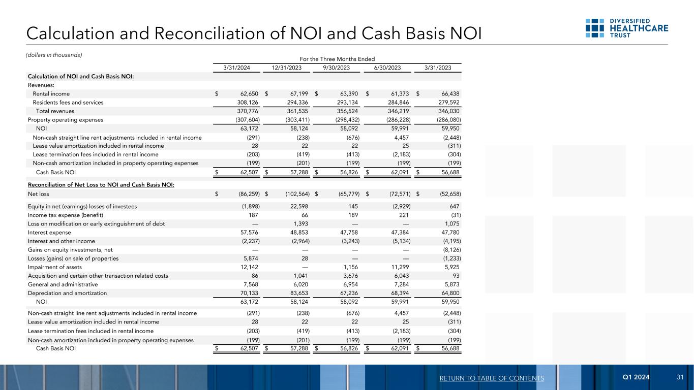 Q1 2024 31 Calculation and Reconciliation of NOI and Cash Basis NOI (dollars in thousands) RETURN TO TABLE OF CONTENTS For the Three Months Ended 3/31/2024 12/31/2023 9/30/2023 6/30/2023 3/31/2023 Calculation of NOI and Cash Basis NOI: Revenues: Rental income $ 62,650 $ 67,199 $ 63,390 $ 61,373 $ 66,438 Residents fees and services 308,126 294,336 293,134 284,846 279,592 Total revenues 370,776 361,535 356,524 346,219 346,030 Property operating expenses (307,604) (303,411) (298,432) (286,228) (286,080) NOI 63,172 58,124 58,092 59,991 59,950 Non-cash straight line rent adjustments included in rental income (291) (238) (676) 4,457 (2,448) Lease value amortization included in rental income 28 22 22 25 (311) Lease termination fees included in rental income (203) (419) (413) (2,183) (304) Non-cash amortization included in property operating expenses (199) (201) (199) (199) (199) Cash Basis NOI $ 62,507 $ 57,288 $ 56,826 $ 62,091 $ 56,688 Reconciliation of Net Loss to NOI and Cash Basis NOI: Net loss $ (86,259) $ (102,564) $ (65,779) $ (72,571) $ (52,658) Equity in net (earnings) losses of investees (1,898) 22,598 145 (2,929) 647 Income tax expense (benefit) 187 66 189 221 (31) Loss on modification or early extinguishment of debt — 1,393 — — 1,075 Interest expense 57,576 48,853 47,758 47,384 47,780 Interest and other income (2,237) (2,964) (3,243) (5,134) (4,195) Gains on equity investments, net — — — — (8,126) Losses (gains) on sale of properties 5,874 28 — — (1,233) Impairment of assets 12,142 — 1,156 11,299 5,925 Acquisition and certain other transaction related costs 86 1,041 3,676 6,043 93 General and administrative 7,568 6,020 6,954 7,284 5,873 Depreciation and amortization 70,133 83,653 67,236 68,394 64,800 NOI 63,172 58,124 58,092 59,991 59,950 Non-cash straight line rent adjustments included in rental income (291) (238) (676) 4,457 (2,448) Lease value amortization included in rental income 28 22 22 25 (311) Lease termination fees included in rental income (203) (419) (413) (2,183) (304) Non-cash amortization included in property operating expenses (199) (201) (199) (199) (199) Cash Basis NOI $ 62,507 $ 57,288 $ 56,826 $ 62,091 $ 56,688