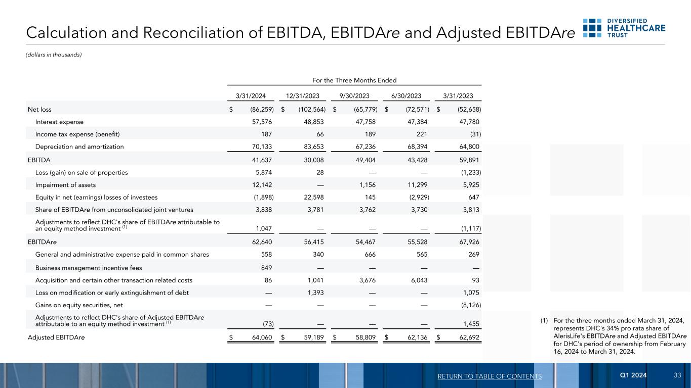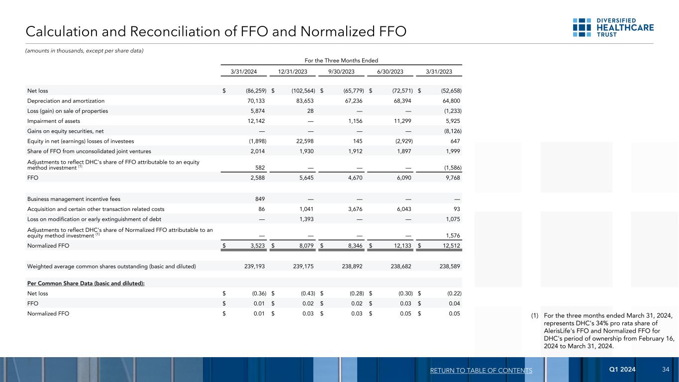 Q1 2024 33 Calculation and Reconciliation of EBITDA, EBITDAre and Adjusted EBITDAre (dollars in thousands) For the Three Months Ended 3/31/2024 12/31/2023 9/30/2023 6/30/2023 3/31/2023 Net loss $ (86,259) $ (102,564) $ (65,779) $ (72,571) $ (52,658) Interest expense 57,576 48,853 47,758 47,384 47,780 Income tax expense (benefit) 187 66 189 221 (31) Depreciation and amortization 70,133 83,653 67,236 68,394 64,800 EBITDA 41,637 30,008 49,404 43,428 59,891 Loss (gain) on sale of properties 5,874 28 — — (1,233) Impairment of assets 12,142 — 1,156 11,299 5,925 Equity in net (earnings) losses of investees (1,898) 22,598 145 (2,929) 647 Share of EBITDAre from unconsolidated joint ventures 3,838 3,781 3,762 3,730 3,813 Adjustments to reflect DHC's share of EBITDAre attributable to an equity method investment (1) 1,047 — — — (1,117) EBITDAre 62,640 56,415 54,467 55,528 67,926 General and administrative expense paid in common shares 558 340 666 565 269 Business management incentive fees 849 — — — — Acquisition and certain other transaction related costs 86 1,041 3,676 6,043 93 Loss on modification or early extinguishment of debt — 1,393 — — 1,075 Gains on equity securities, net — — — — (8,126) Adjustments to reflect DHC's share of Adjusted EBITDAre attributable to an equity method investment (1) (73) — — — 1,455 Adjusted EBITDAre $ 64,060 $ 59,189 $ 58,809 $ 62,136 $ 62,692 RETURN TO TABLE OF CONTENTS (1) For the three months ended March 31, 2024, represents DHC's 34% pro rata share of AlerisLife's EBITDAre and Adjusted EBITDAre for DHC's period of ownership from February 16, 2024 to March 31, 2024.
