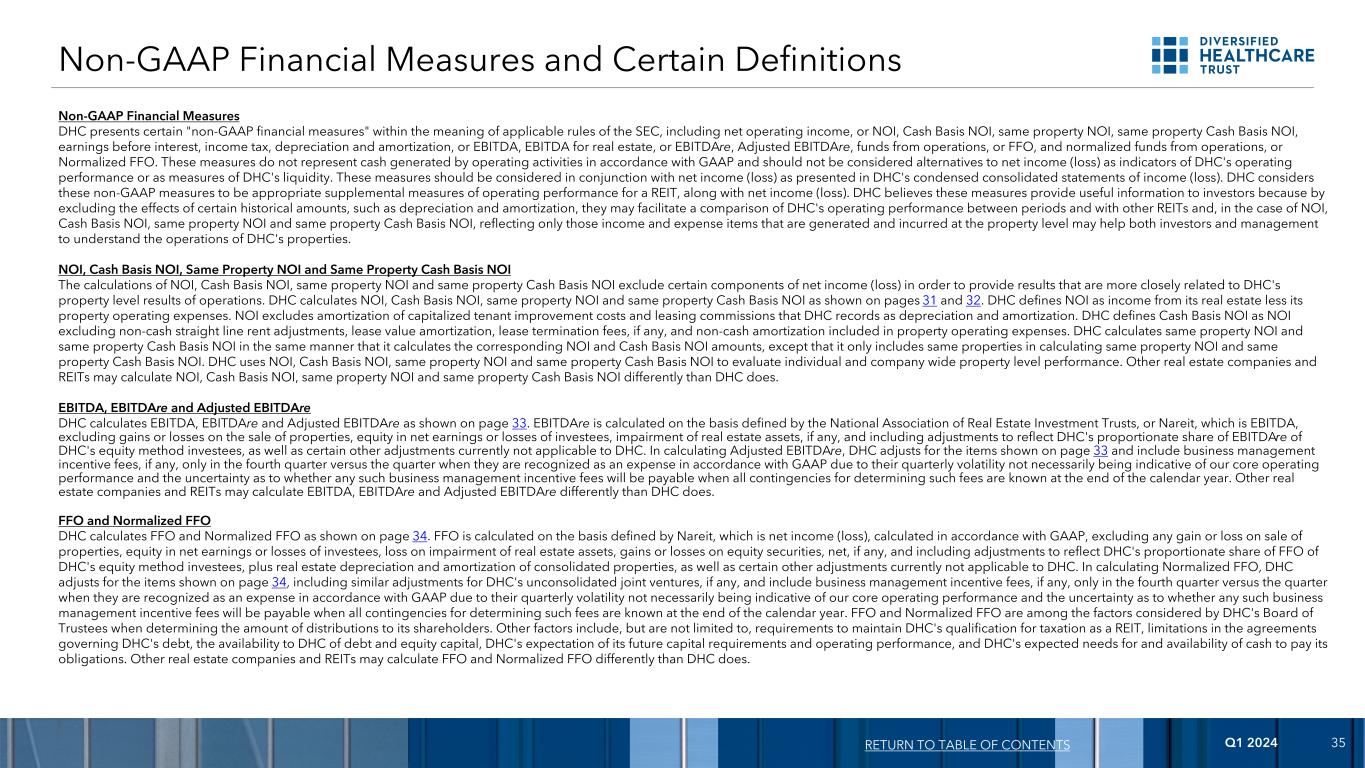 Q1 2024 34 Calculation and Reconciliation of FFO and Normalized FFO (amounts in thousands, except per share data) RETURN TO TABLE OF CONTENTS For the Three Months Ended 3/31/2024 12/31/2023 9/30/2023 6/30/2023 3/31/2023 Net loss $ (86,259) $ (102,564) $ (65,779) $ (72,571) $ (52,658) Depreciation and amortization 70,133 83,653 67,236 68,394 64,800 Loss (gain) on sale of properties 5,874 28 — — (1,233) Impairment of assets 12,142 — 1,156 11,299 5,925 Gains on equity securities, net — — — — (8,126) Equity in net (earnings) losses of investees (1,898) 22,598 145 (2,929) 647 Share of FFO from unconsolidated joint ventures 2,014 1,930 1,912 1,897 1,999 Adjustments to reflect DHC's share of FFO attributable to an equity method investment (1) 582 — — — (1,586) FFO 2,588 5,645 4,670 6,090 9,768 Business management incentive fees 849 — — — — Acquisition and certain other transaction related costs 86 1,041 3,676 6,043 93 Loss on modification or early extinguishment of debt — 1,393 — — 1,075 Adjustments to reflect DHC's share of Normalized FFO attributable to an equity method investment (1) — — — — 1,576 Normalized FFO $ 3,523 $ 8,079 $ 8,346 $ 12,133 $ 12,512 Weighted average common shares outstanding (basic and diluted) 239,193 239,175 238,892 238,682 238,589 Per Common Share Data (basic and diluted): Net loss $ (0.36) $ (0.43) $ (0.28) $ (0.30) $ (0.22) FFO $ 0.01 $ 0.02 $ 0.02 $ 0.03 $ 0.04 Normalized FFO $ 0.01 $ 0.03 $ 0.03 $ 0.05 $ 0.05 (1) For the three months ended March 31, 2024, represents DHC's 34% pro rata share of AlerisLife's FFO and Normalized FFO for DHC's period of ownership from February 16, 2024 to March 31, 2024.