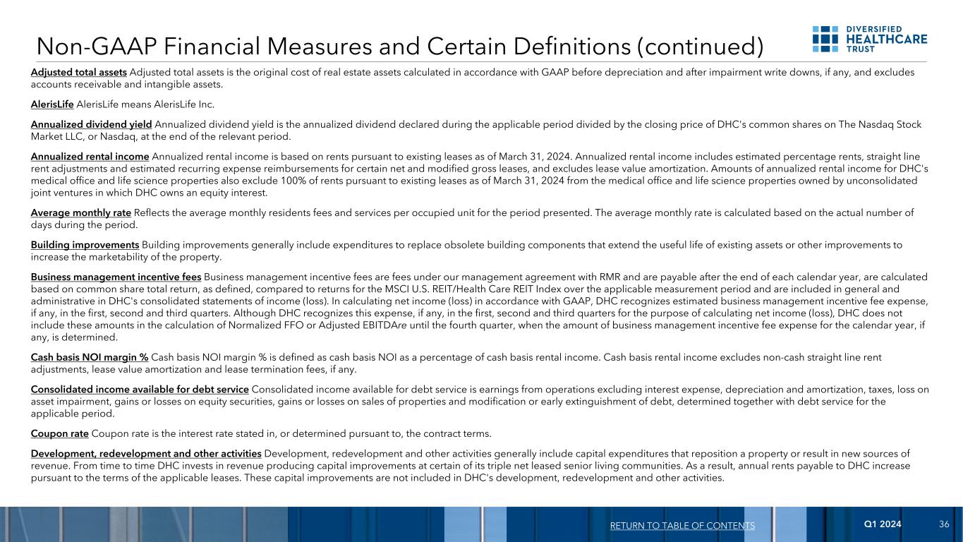 Q1 2024 36 Adjusted total assets Adjusted total assets is the original cost of real estate assets calculated in accordance with GAAP before depreciation and after impairment write downs, if any, and excludes accounts receivable and intangible assets. AlerisLife AlerisLife means AlerisLife Inc. Annualized dividend yield Annualized dividend yield is the annualized dividend declared during the applicable period divided by the closing price of DHC's common shares on The Nasdaq Stock Market LLC, or Nasdaq, at the end of the relevant period. Annualized rental income Annualized rental income is based on rents pursuant to existing leases as of March 31, 2024. Annualized rental income includes estimated percentage rents, straight line rent adjustments and estimated recurring expense reimbursements for certain net and modified gross leases, and excludes lease value amortization. Amounts of annualized rental income for DHC's medical office and life science properties also exclude 100% of rents pursuant to existing leases as of March 31, 2024 from the medical office and life science properties owned by unconsolidated joint ventures in which DHC owns an equity interest. Average monthly rate Reflects the average monthly residents fees and services per occupied unit for the period presented. The average monthly rate is calculated based on the actual number of days during the period. Building improvements Building improvements generally include expenditures to replace obsolete building components that extend the useful life of existing assets or other improvements to increase the marketability of the property. Business management incentive fees Business management incentive fees are fees under our management agreement with RMR and are payable after the end of each calendar year, are calculated based on common share total return, as defined, compared to returns for the MSCI U.S. REIT/Health Care REIT Index over the applicable measurement period and are included in general and administrative in DHC's consolidated statements of income (loss). In calculating net income (loss) in accordance with GAAP, DHC recognizes estimated business management incentive fee expense, if any, in the first, second and third quarters. Although DHC recognizes this expense, if any, in the first, second and third quarters for the purpose of calculating net income (loss), DHC does not include these amounts in the calculation of Normalized FFO or Adjusted EBITDAre until the fourth quarter, when the amount of business management incentive fee expense for the calendar year, if any, is determined. Cash basis NOI margin % Cash basis NOI margin % is defined as cash basis NOI as a percentage of cash basis rental income. Cash basis rental income excludes non-cash straight line rent adjustments, lease value amortization and lease termination fees, if any. Consolidated income available for debt service Consolidated income available for debt service is earnings from operations excluding interest expense, depreciation and amortization, taxes, loss on asset impairment, gains or losses on equity securities, gains or losses on sales of properties and modification or early extinguishment of debt, determined together with debt service for the applicable period. Coupon rate Coupon rate is the interest rate stated in, or determined pursuant to, the contract terms. Development, redevelopment and other activities Development, redevelopment and other activities generally include capital expenditures that reposition a property or result in new sources of revenue. From time to time DHC invests in revenue producing capital improvements at certain of its triple net leased senior living communities. As a result, annual rents payable to DHC increase pursuant to the terms of the applicable leases. These capital improvements are not included in DHC's development, redevelopment and other activities. Non-GAAP Financial Measures and Certain Definitions (continued) RETURN TO TABLE OF CONTENTS