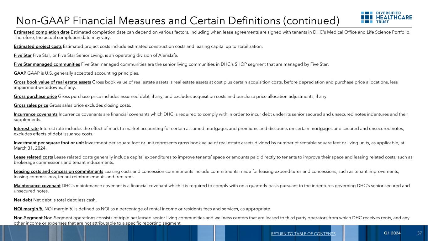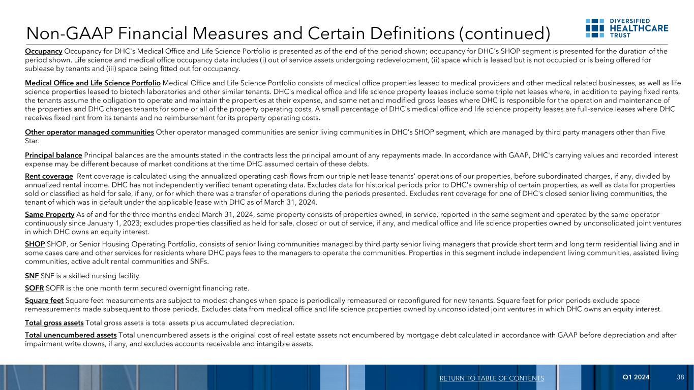 Q1 2024 37 Estimated completion date Estimated completion date can depend on various factors, including when lease agreements are signed with tenants in DHC's Medical Office and Life Science Portfolio. Therefore, the actual completion date may vary. Estimated project costs Estimated project costs include estimated construction costs and leasing capital up to stabilization. Five Star Five Star, or Five Star Senior Living, is an operating division of AlerisLife. Five Star managed communities Five Star managed communities are the senior living communities in DHC's SHOP segment that are managed by Five Star. GAAP GAAP is U.S. generally accepted accounting principles. Gross book value of real estate assets Gross book value of real estate assets is real estate assets at cost plus certain acquisition costs, before depreciation and purchase price allocations, less impairment writedowns, if any. Gross purchase price Gross purchase price includes assumed debt, if any, and excludes acquisition costs and purchase price allocation adjustments, if any. Gross sales price Gross sales price excludes closing costs. Incurrence covenants Incurrence covenants are financial covenants which DHC is required to comply with in order to incur debt under its senior secured and unsecured notes indentures and their supplements. Interest rate Interest rate includes the effect of mark to market accounting for certain assumed mortgages and premiums and discounts on certain mortgages and secured and unsecured notes; excludes effects of debt issuance costs. Investment per square foot or unit Investment per square foot or unit represents gross book value of real estate assets divided by number of rentable square feet or living units, as applicable, at March 31, 2024. Lease related costs Lease related costs generally include capital expenditures to improve tenants’ space or amounts paid directly to tenants to improve their space and leasing related costs, such as brokerage commissions and tenant inducements. Leasing costs and concession commitments Leasing costs and concession commitments include commitments made for leasing expenditures and concessions, such as tenant improvements, leasing commissions, tenant reimbursements and free rent. Maintenance covenant DHC's maintenance covenant is a financial covenant which it is required to comply with on a quarterly basis pursuant to the indentures governing DHC's senior secured and unsecured notes. Net debt Net debt is total debt less cash. NOI margin % NOI margin % is defined as NOI as a percentage of rental income or residents fees and services, as appropriate. Non-Segment Non-Segment operations consists of triple net leased senior living communities and wellness centers that are leased to third party operators from which DHC receives rents, and any other income or expenses that are not attributable to a specific reporting segment. Non-GAAP Financial Measures and Certain Definitions (continued) RETURN TO TABLE OF CONTENTS