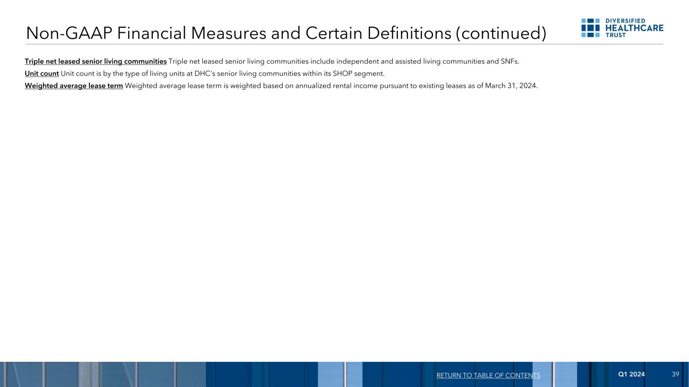 Q1 2024 38 Occupancy Occupancy for DHC's Medical Office and Life Science Portfolio is presented as of the end of the period shown; occupancy for DHC's SHOP segment is presented for the duration of the period shown. Life science and medical office occupancy data includes (i) out of service assets undergoing redevelopment, (ii) space which is leased but is not occupied or is being offered for sublease by tenants and (iii) space being fitted out for occupancy. Medical Office and Life Science Portfolio Medical Office and Life Science Portfolio consists of medical office properties leased to medical providers and other medical related businesses, as well as life science properties leased to biotech laboratories and other similar tenants. DHC's medical office and life science property leases include some triple net leases where, in addition to paying fixed rents, the tenants assume the obligation to operate and maintain the properties at their expense, and some net and modified gross leases where DHC is responsible for the operation and maintenance of the properties and DHC charges tenants for some or all of the property operating costs. A small percentage of DHC's medical office and life science property leases are full-service leases where DHC receives fixed rent from its tenants and no reimbursement for its property operating costs. Other operator managed communities Other operator managed communities are senior living communities in DHC's SHOP segment, which are managed by third party managers other than Five Star. Principal balance Principal balances are the amounts stated in the contracts less the principal amount of any repayments made. In accordance with GAAP, DHC's carrying values and recorded interest expense may be different because of market conditions at the time DHC assumed certain of these debts. Rent coverage Rent coverage is calculated using the annualized operating cash flows from our triple net lease tenants' operations of our properties, before subordinated charges, if any, divided by annualized rental income. DHC has not independently verified tenant operating data. Excludes data for historical periods prior to DHC's ownership of certain properties, as well as data for properties sold or classified as held for sale, if any, or for which there was a transfer of operations during the periods presented. Excludes rent coverage for one of DHC's closed senior living communities, the tenant of which was in default under the applicable lease with DHC as of March 31, 2024. Same Property As of and for the three months ended March 31, 2024, same property consists of properties owned, in service, reported in the same segment and operated by the same operator continuously since January 1, 2023; excludes properties classified as held for sale, closed or out of service, if any, and medical office and life science properties owned by unconsolidated joint ventures in which DHC owns an equity interest. SHOP SHOP, or Senior Housing Operating Portfolio, consists of senior living communities managed by third party senior living managers that provide short term and long term residential living and in some cases care and other services for residents where DHC pays fees to the managers to operate the communities. Properties in this segment include independent living communities, assisted living communities, active adult rental communities and SNFs. SNF SNF is a skilled nursing facility. SOFR SOFR is the one month term secured overnight financing rate. Square feet Square feet measurements are subject to modest changes when space is periodically remeasured or reconfigured for new tenants. Square feet for prior periods exclude space remeasurements made subsequent to those periods. Excludes data from medical office and life science properties owned by unconsolidated joint ventures in which DHC owns an equity interest. Total gross assets Total gross assets is total assets plus accumulated depreciation. Total unencumbered assets Total unencumbered assets is the original cost of real estate assets not encumbered by mortgage debt calculated in accordance with GAAP before depreciation and after impairment write downs, if any, and excludes accounts receivable and intangible assets. Non-GAAP Financial Measures and Certain Definitions (continued) RETURN TO TABLE OF CONTENTS