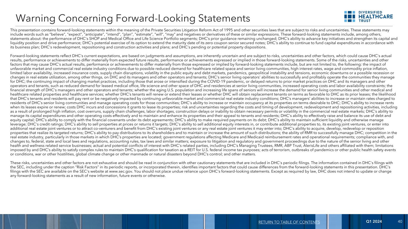 Q1 2024 39 Triple net leased senior living communities Triple net leased senior living communities include independent and assisted living communities and SNFs. Unit count Unit count is by the type of living units at DHC's senior living communities within its SHOP segment. Weighted average lease term Weighted average lease term is weighted based on annualized rental income pursuant to existing leases as of March 31, 2024. Non-GAAP Financial Measures and Certain Definitions (continued) RETURN TO TABLE OF CONTENTS
