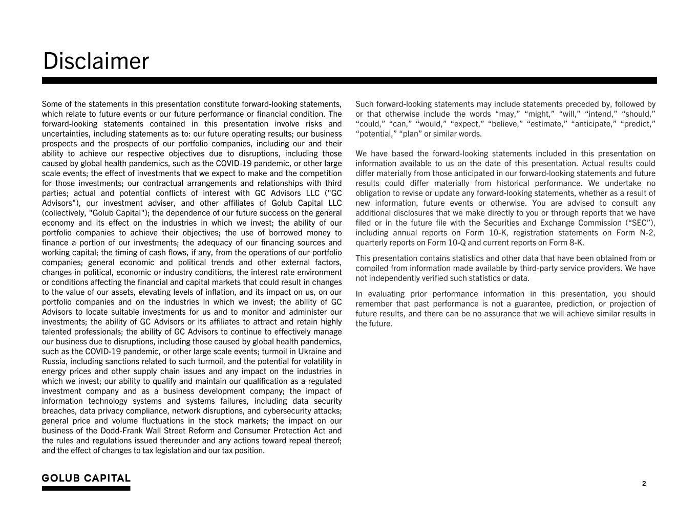 2 Such forward-looking statements may include statements preceded by, followed by or that otherwise include the words “may,” “might,” “will,” “intend,” “should,” “could,” “can,” “would,” “expect,” “believe,” “estimate,” “anticipate,” “predict,” “potential,” “plan” or similar words. We have based the forward-looking statements included in this presentation on information available to us on the date of this presentation. Actual results could differ materially from those anticipated in our forward-looking statements and future results could differ materially from historical performance. We undertake no obligation to revise or update any forward-looking statements, whether as a result of new information, future events or otherwise. You are advised to consult any additional disclosures that we make directly to you or through reports that we have filed or in the future file with the Securities and Exchange Commission (“SEC”), including annual reports on Form 10-K, registration statements on Form N-2, quarterly reports on Form 10-Q and current reports on Form 8-K. This presentation contains statistics and other data that have been obtained from or compiled from information made available by third-party service providers. We have not independently verified such statistics or data. In evaluating prior performance information in this presentation, you should remember that past performance is not a guarantee, prediction, or projection of future results, and there can be no assurance that we will achieve similar results in the future. Some of the statements in this presentation constitute forward-looking statements, which relate to future events or our future performance or financial condition. The forward-looking statements contained in this presentation involve risks and uncertainties, including statements as to: our future operating results; our business prospects and the prospects of our portfolio companies, including our and their ability to achieve our respective objectives due to disruptions, including those caused by global health pandemics, such as the COVID-19 pandemic, or other large scale events; the effect of investments that we expect to make and the competition for those investments; our contractual arrangements and relationships with third parties; actual and potential conflicts of interest with GC Advisors LLC ("GC Advisors"), our investment adviser, and other affiliates of Golub Capital LLC (collectively, "Golub Capital"); the dependence of our future success on the general economy and its effect on the industries in which we invest; the ability of our portfolio companies to achieve their objectives; the use of borrowed money to finance a portion of our investments; the adequacy of our financing sources and working capital; the timing of cash flows, if any, from the operations of our portfolio companies; general economic and political trends and other external factors, changes in political, economic or industry conditions, the interest rate environment or conditions affecting the financial and capital markets that could result in changes to the value of our assets, elevating levels of inflation, and its impact on us, on our portfolio companies and on the industries in which we invest; the ability of GC Advisors to locate suitable investments for us and to monitor and administer our investments; the ability of GC Advisors or its affiliates to attract and retain highly talented professionals; the ability of GC Advisors to continue to effectively manage our business due to disruptions, including those caused by global health pandemics, such as the COVID-19 pandemic, or other large scale events; turmoil in Ukraine and Russia, including sanctions related to such turmoil, and the potential for volatility in energy prices and other supply chain issues and any impact on the industries in which we invest; our ability to qualify and maintain our qualification as a regulated investment company and as a business development company; the impact of information technology systems and systems failures, including data security breaches, data privacy compliance, network disruptions, and cybersecurity attacks; general price and volume fluctuations in the stock markets; the impact on our business of the Dodd-Frank Wall Street Reform and Consumer Protection Act and the rules and regulations issued thereunder and any actions toward repeal thereof; and the effect of changes to tax legislation and our tax position. Disclaimer