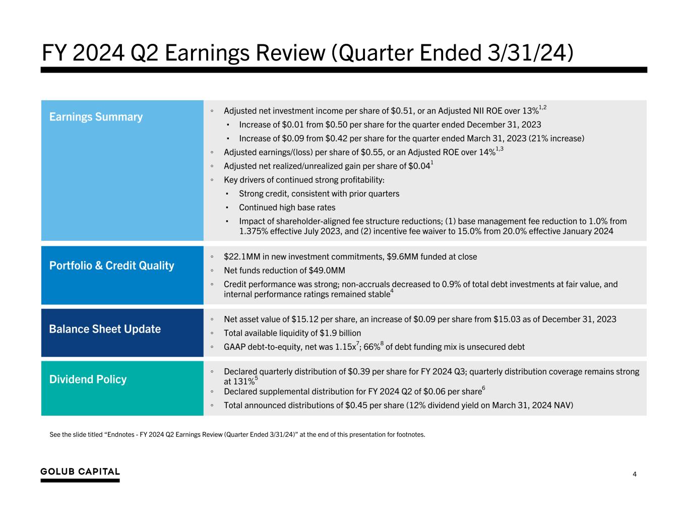 ◦ Adjusted net investment income per share of $0.51, or an Adjusted NII ROE over 13%1,2 ▪ Increase of $0.01 from $0.50 per share for the quarter ended December 31, 2023 ▪ Increase of $0.09 from $0.42 per share for the quarter ended March 31, 2023 (21% increase) ◦ Adjusted earnings/(loss) per share of $0.55, or an Adjusted ROE over 14%1,3 ◦ Adjusted net realized/unrealized gain per share of $0.041 ◦ Key drivers of continued strong profitability: ▪ Strong credit, consistent with prior quarters ▪ Continued high base rates ▪ Impact of shareholder-aligned fee structure reductions; (1) base management fee reduction to 1.0% from 1.375% effective July 2023, and (2) incentive fee waiver to 15.0% from 20.0% effective January 2024 FY 2024 Q2 Earnings Review (Quarter Ended 3/31/24) Earnings Summary ◦ $22.1MM in new investment commitments, $9.6MM funded at close ◦ Net funds reduction of $49.0MM ◦ Credit performance was strong; non-accruals decreased to 0.9% of total debt investments at fair value, and internal performance ratings remained stable4 Portfolio & Credit Quality ◦ Net asset value of $15.12 per share, an increase of $0.09 per share from $15.03 as of December 31, 2023 ◦ Total available liquidity of $1.9 billion ◦ GAAP debt-to-equity, net was 1.15x7; 66%8 of debt funding mix is unsecured debt ◦ Declared quarterly distribution of $0.39 per share for FY 2024 Q3; quarterly distribution coverage remains strong at 131%5 ◦ Declared supplemental distribution for FY 2024 Q2 of $0.06 per share6 ◦ Total announced distributions of $0.45 per share (12% dividend yield on March 31, 2024 NAV) Balance Sheet Update Dividend Policy 4 Dividend Policy See the slide titled “Endnotes - FY 2024 Q2 Earnings Review (Quarter Ended 3/31/24)” at the end of this presentation for footnotes.