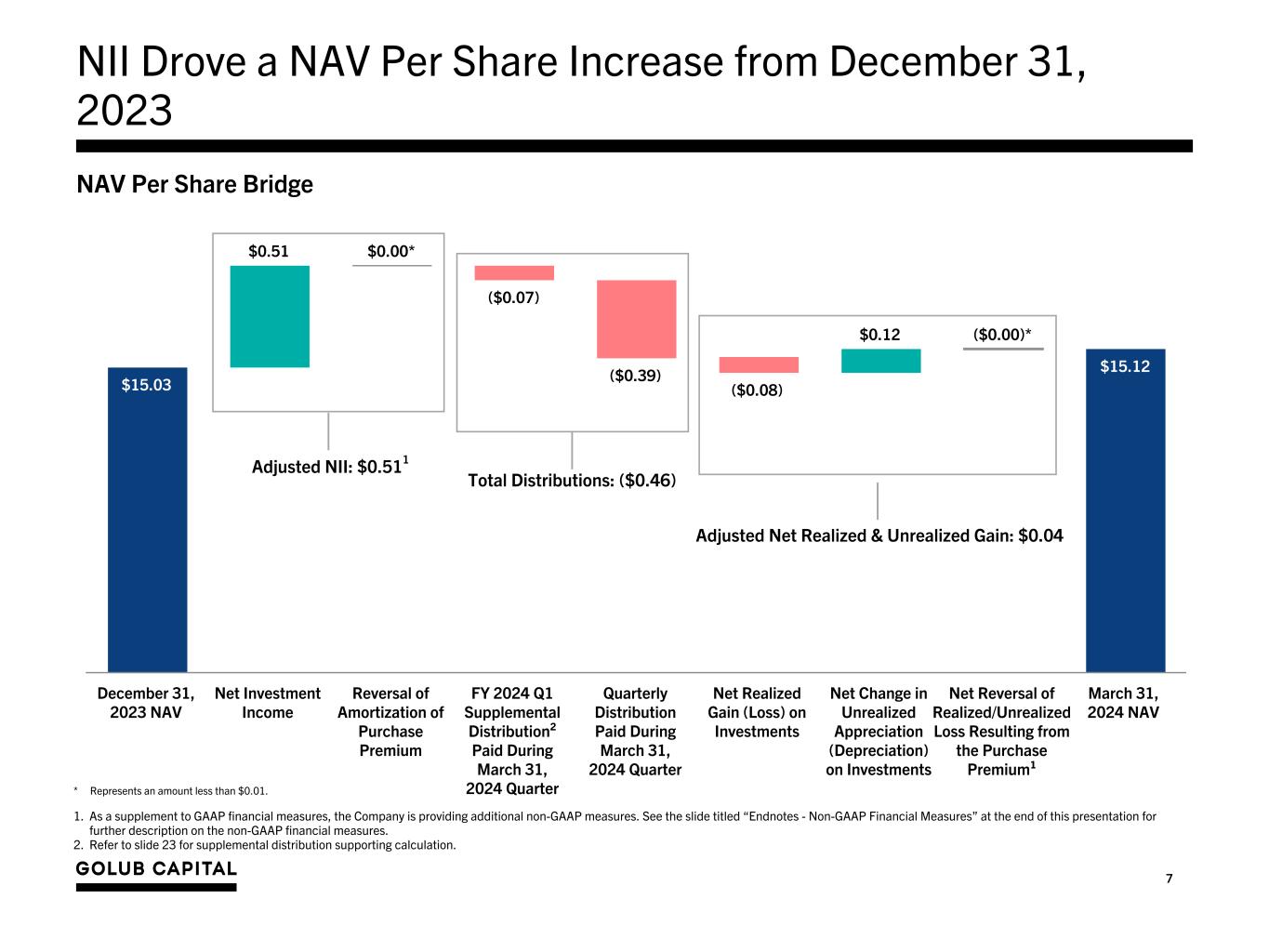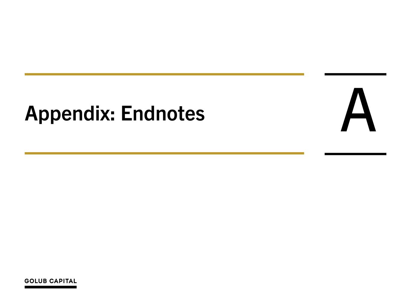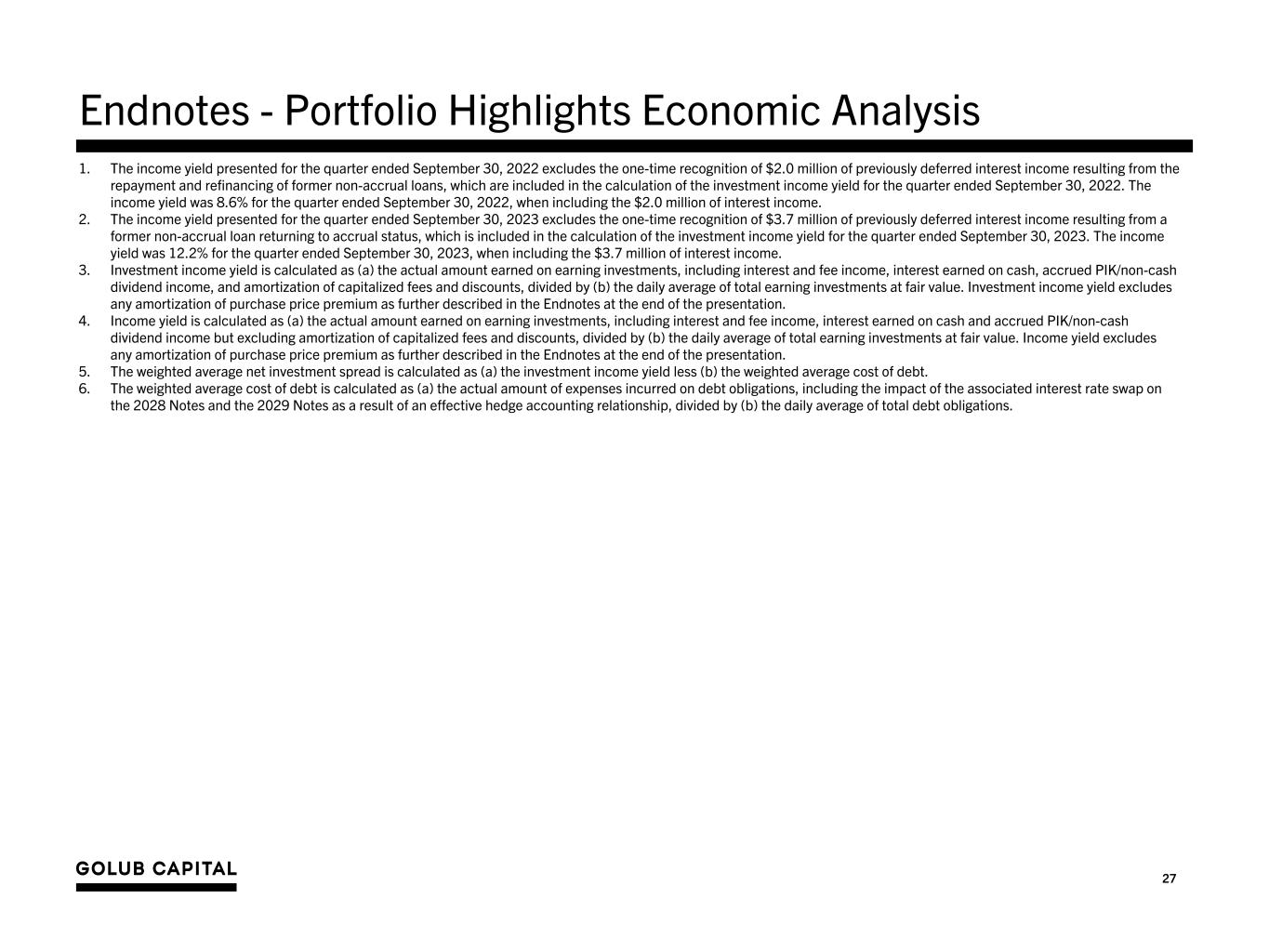 26 Endnotes - Non-GAAP Financial Measures 1. On September 16, 2019, the Company completed its acquisition of GCIC. The merger was accounted for under the asset acquisition method of accounting in accordance with Accounting Standards Codification (“ASC”) 805-50, Business Combinations — Related Issues. Under asset acquisition accounting, where the consideration paid to GCIC’s stockholders exceeded the relative fair values of the assets acquired, the premium paid by GBDC was allocated to the cost of the GCIC assets acquired by GBDC pro-rata based on their relative fair value. Immediately following the acquisition of GCIC, GBDC recorded its assets at their respective fair values and, as a result, the purchase premium allocated to the cost basis of the GCIC assets acquired was immediately recognized as unrealized depreciation on the Company's Consolidated Statement of Operations. The purchase premium allocated to investments in loan securities will amortize over the life of the loans through interest income with a corresponding reversal of the unrealized depreciation on the GCIC loans acquired through their ultimate disposition. The purchase premium allocated to investments in equity securities will not amortize over the life of the equity securities through interest income and, assuming no subsequent change to the fair value of the GCIC equity securities acquired and disposition of such equity securities at fair value, the Company will recognize a realized loss with a corresponding reversal of the unrealized depreciation upon disposition of the GCIC equity securities acquired. As a supplement to U.S. generally accepted accounting principles (“GAAP”) financial measures, the Company has provided the following non-GAAP financial measures: • “Adjusted Net Investment Income” and “Adjusted Net Investment Income Per Share” - excludes the amortization of the purchase premium from net investment income calculated in accordance with GAAP. • “Adjusted Net Realized and Unrealized Gain/(Loss)” and “Adjusted Net Realized and Unrealized Gain/(Loss) Per Share” - excludes the unrealized loss resulting from the purchase premium write-down and the corresponding reversal of the unrealized loss resulting from the amortization of the premium on loans or from the sale of equity investments from the determination of realized and unrealized gain/(loss) in accordance with GAAP. • “Adjusted Net Income” and “Adjusted Earnings/(Loss) Per Share” – calculates net income and earnings per share based on Adjusted Net Investment Income and Adjusted Net Realized and Unrealized Gain/(Loss). The Company believes that excluding the financial impact of the purchase premium in the above non-GAAP financial measures is useful for investors as this is a non-cash expense/ loss and is one method the Company uses to measure its financial condition and results of operations. In addition to the non-GAAP financial measures above, the Company has provided the non-GAAP financial measure “Adjusted Net Investment Income Before Accrual for Capital Gain Incentive Fee” and “Adjusted Net Investment Income Before Accrual for Capital Gain Incentive Fee Per Share”, which excludes the accrual for the capital gain incentive fee required under GAAP (including the portion of such accrual that is not payable under GBDC’s investment advisory agreement) from Adjusted Net Investment Income. The Company believes excluding the accrual of the capital gain incentive fee as a non-GAAP financial measure is useful as a portion of such accrual is not contractually payable under the terms of either the Company’s current investment advisory agreement with GC Advisors, which was effective September 16, 2019, or its prior investment advisory agreement with GC Advisors, (each an, “Investment Advisory Agreement”). In accordance with GAAP, the Company is required to include aggregate unrealized appreciation on investments in the calculation and accrue a capital gain incentive fee on a quarterly basis as if such unrealized capital appreciation were realized, even though such unrealized capital appreciation is not permitted to be considered in calculating the fee actually payable under either Investment Advisory Agreement. As of March 31, 2024, there was no cumulative capital gain incentive fee accrued by the Company in accordance with GAAP, and none was payable as a capital gain incentive fee pursuant to the current Investment Advisory Agreement as of March 31, 2024. Any payment due under the terms of the current Investment Advisory Agreement is based on the calculation at the end of each calendar year or upon termination of the Investment Advisory Agreement. The Company paid capital gain incentive fees in the amounts of $1.2 million and $1.6 million calculated in accordance with its prior Investment Advisory Agreement as of December 31, 2017 and 2018, respectively. The Company did not pay any capital gain incentive fee under the Investment Advisory Agreement for any period ended prior to December 31, 2017. Although these non-GAAP financial measures are intended to enhance investors’ understanding of the Company’s business and performance, these non-GAAP financial measures should not be considered an alternative to GAAP. Refer to slide ‘Summary of Quarterly Results’ for a reconciliation to the nearest GAAP measures. 2. Purchase premium refers to the premium paid by GBDC to acquire GCIC in excess of the fair value of the assets acquired.