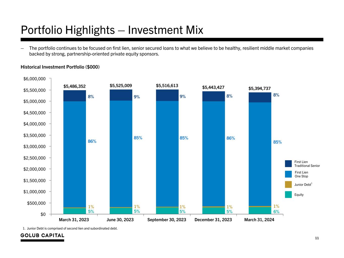 Portfolio Highlights - New Originations Quarter Ended March 31, 2023 June 30, 2023 September 30, 2023 December 31, 2023 March 31, 2024 Select Portfolio Funds Roll Data (in millions) New Investment Commitments $157.4 $110.7 $129.6 $58.6 $22.1 Exits and Sales of Investments 140.2 113.2 119.3 179.2 143.7 Net Funds Growth1 34.4 38.7 (8.4) (73.2) (48.7) Asset Mix of New Investments Senior Secured 0% 1% 10% 13% 2% One Stop 98% 99% 80% 84% 96% Junior Debt2 0% 0% 8% 0%* 0%* Equity and Other Investments 2% 0%* 2% 3% 1% Portfolio Rotation - Debt Investments Weighted average rate on new investments3 11.8% 12.0% 11.8% 11.0% 11.0% Weighted average spread over the applicable base rate of new floating rate investments4 7.1% 6.6% 6.1% 5.7% 5.8% Weighted average interest rate on investments that paid-off5 10.3% 10.3% 10.7% 10.4% 12.0% Weighted average fees on new investments 1.8% 1.6% 1.6% 1.1% 0.9% * Represents an amount less than 1% 1. Net funds growth includes the impact of new investments and exits of investments as noted in the table above, as well as other variables such as net funding on revolvers, net change in unamortized fees, net change in unrealized appreciation (depreciation), etc. 2. Junior Debt is comprised of subordinated debt and second lien loans. 3. Weighted average interest rate on new loan investments is based on the contractual interest rate at the time of funding. For variable rate loans that have a Secured Overnight Financing Rate (“SOFR”), Prime or an applicable foreign base rate for loans denominated in foreign currency, the contractual rate is calculated using the current applicable base rate, the spread over the applicable base rate and the impact of any floor. For positions that have a SOFR and Prime rate option, the contractual rate is calculated using current SOFR at the time of funding, the spread over SOFR and the impact of any SOFR floor. For fixed rate loans, the contract rate is the stated fixed rate. 4. Weighted average spread over the applicable base rate of new floating rate loan investments is based on the contractual interest rate spread at the time of funding. Applicable base rates include SOFR, Prime and applicable foreign base rates for loans denominated in foreign currency. For variable rate loans that have a SOFR and Prime rate option, the SOFR spread was used in the calculation. For variable rate loans that only have a Prime rate option, the Prime spread was used. 5. Excludes the disposition of non-accrual assets. – Total investments at fair value decreased by approximately 0.9%, or $48.7 million, during the three months ended March 31, 2024. 10