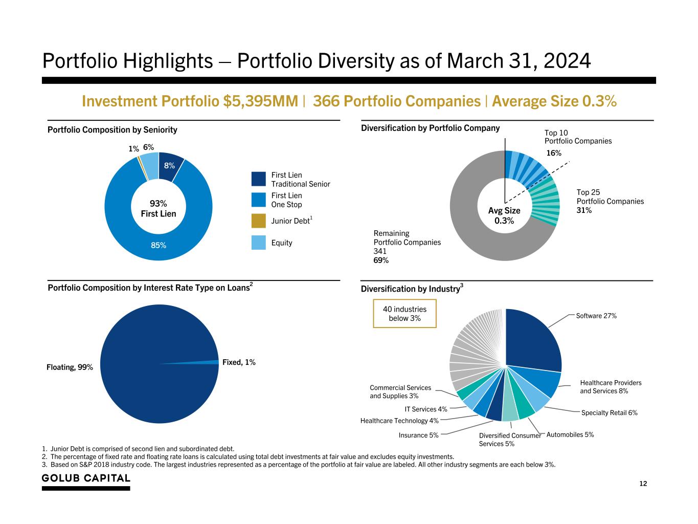 11 $5,486,352 $5,525,009 $5,516,613 $5,443,427 $5,394,737 March 31, 2023 June 30, 2023 September 30, 2023 December 31, 2023 March 31, 2024 $0 $500,000 $1,000,000 $1,500,000 $2,000,000 $2,500,000 $3,000,000 $3,500,000 $4,000,000 $4,500,000 $5,000,000 $5,500,000 $6,000,000 Portfolio Highlights – Investment Mix – The portfolio continues to be focused on first lien, senior secured loans to what we believe to be healthy, resilient middle market companies backed by strong, partnership-oriented private equity sponsors. Historical Investment Portfolio ($000) Equity Junior Debt1 First Lien Traditional Senior 1. Junior Debt is comprised of second lien and subordinated debt. 8% 86% 5% 1% 9% 85% 5% 1% 9% 85% 5% 1% 8% 86% 5% 1% 8% 85% 6% 1% First Lien One Stop