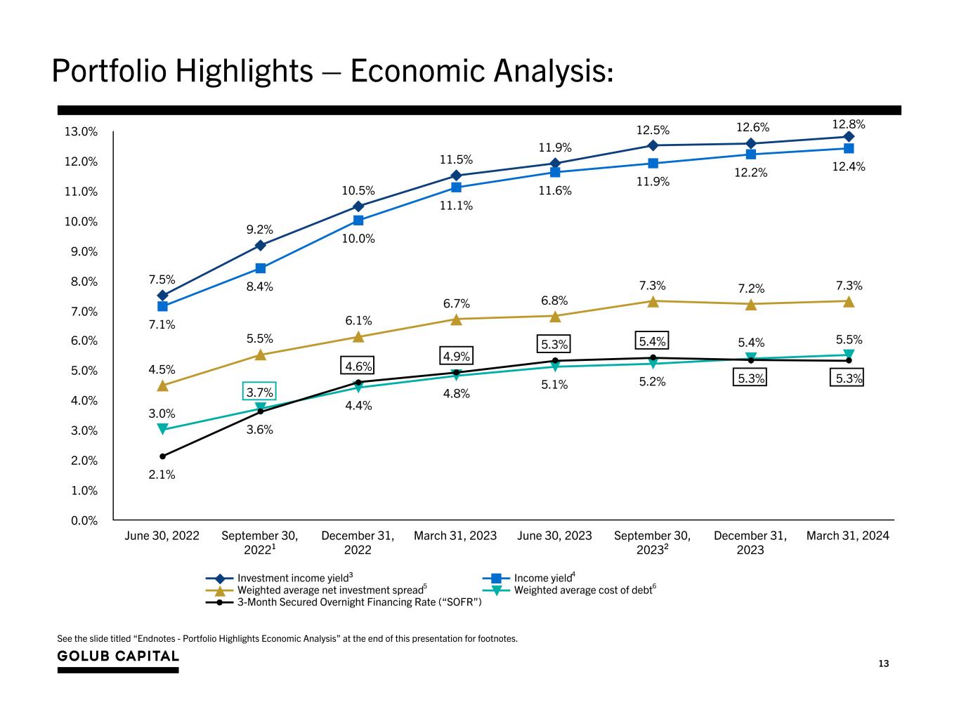 12 6% 8% 85% 1% Software 27% Healthcare Providers and Services 8% Specialty Retail 6% Automobiles 5%Diversified Consumer Services 5% Insurance 5% Healthcare Technology 4% IT Services 4% Commercial Services and Supplies 3% Portfolio Highlights – Portfolio Diversity as of March 31, 2024 Investment Portfolio $5,395MM | 366 Portfolio Companies | Average Size 0.3% 1. Junior Debt is comprised of second lien and subordinated debt. 2. The percentage of fixed rate and floating rate loans is calculated using total debt investments at fair value and excludes equity investments. 3. Based on S&P 2018 industry code. The largest industries represented as a percentage of the portfolio at fair value are labeled. All other industry segments are each below 3%. Diversification by Portfolio Company Equity Junior Debt1 First Lien One Stop First Lien Traditional Senior Top 25 Portfolio Companies 31% Remaining Portfolio Companies 341 69% Top 10 Portfolio Companies 16% Avg Size 0.3% Portfolio Composition by Interest Rate Type on Loans2 Diversification by Industry3 40 industries below 3% Portfolio Composition by Seniority Floating, 99% Fixed, 1% 93% First Lien