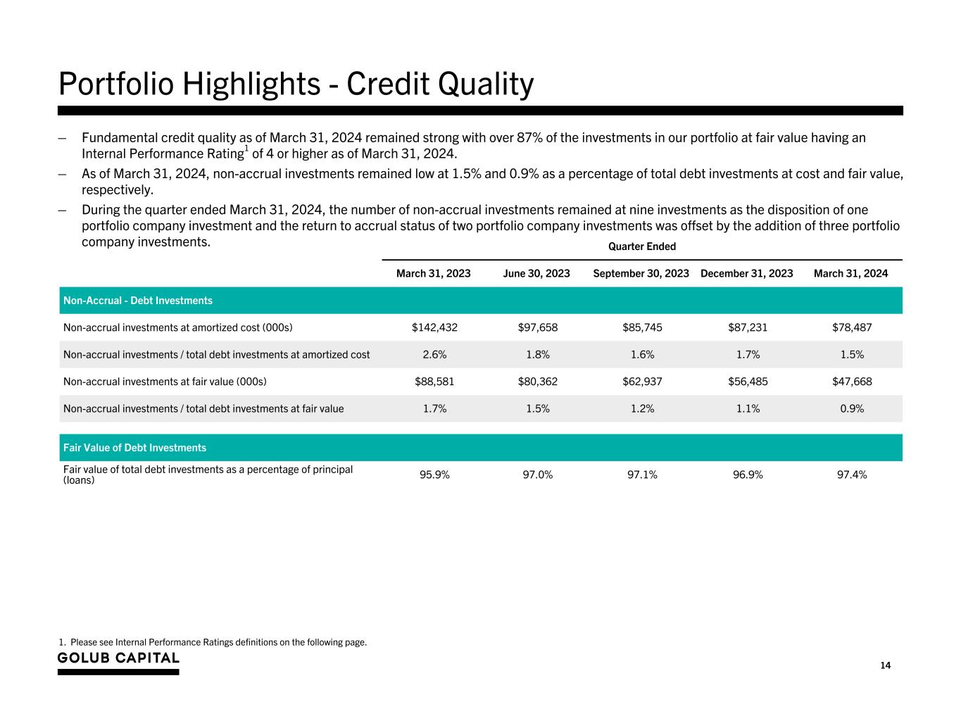 13 See the slide titled “Endnotes - Portfolio Highlights Economic Analysis” at the end of this presentation for footnotes. Portfolio Highlights – Economic Analysis: 7.5% 9.2% 10.5% 11.5% 11.9% 7.1% 8.4% 10.0% 11.1% 11.6% 11.9% 12.2% 12.4% 4.5% 5.5% 6.1% 6.7% 6.8% 7.3% 7.2% 7.3% 3.0% 3.7% 4.4% 4.8% 5.1% 5.2% 5.4% 5.5% 2.1% 3.6% 4.6% 4.9% 5.3% 5.4% 5.3% 5.3% Investment income yield³ Income yield Weighted average net investment spread Weighted average cost of debt 3-Month Secured Overnight Financing Rate (“SOFR”) June 30, 2022 September 30, 2022¹ December 31, 2022 March 31, 2023 June 30, 2023 September 30, 2023² December 31, 2023 March 31, 2024 0.0% 1.0% 2.0% 3.0% 4.0% 5.0% 6.0% 7.0% 8.0% 9.0% 10.0% 11.0% 12.0% 13.0% 4 65 12.5% 12.6% 12.8%