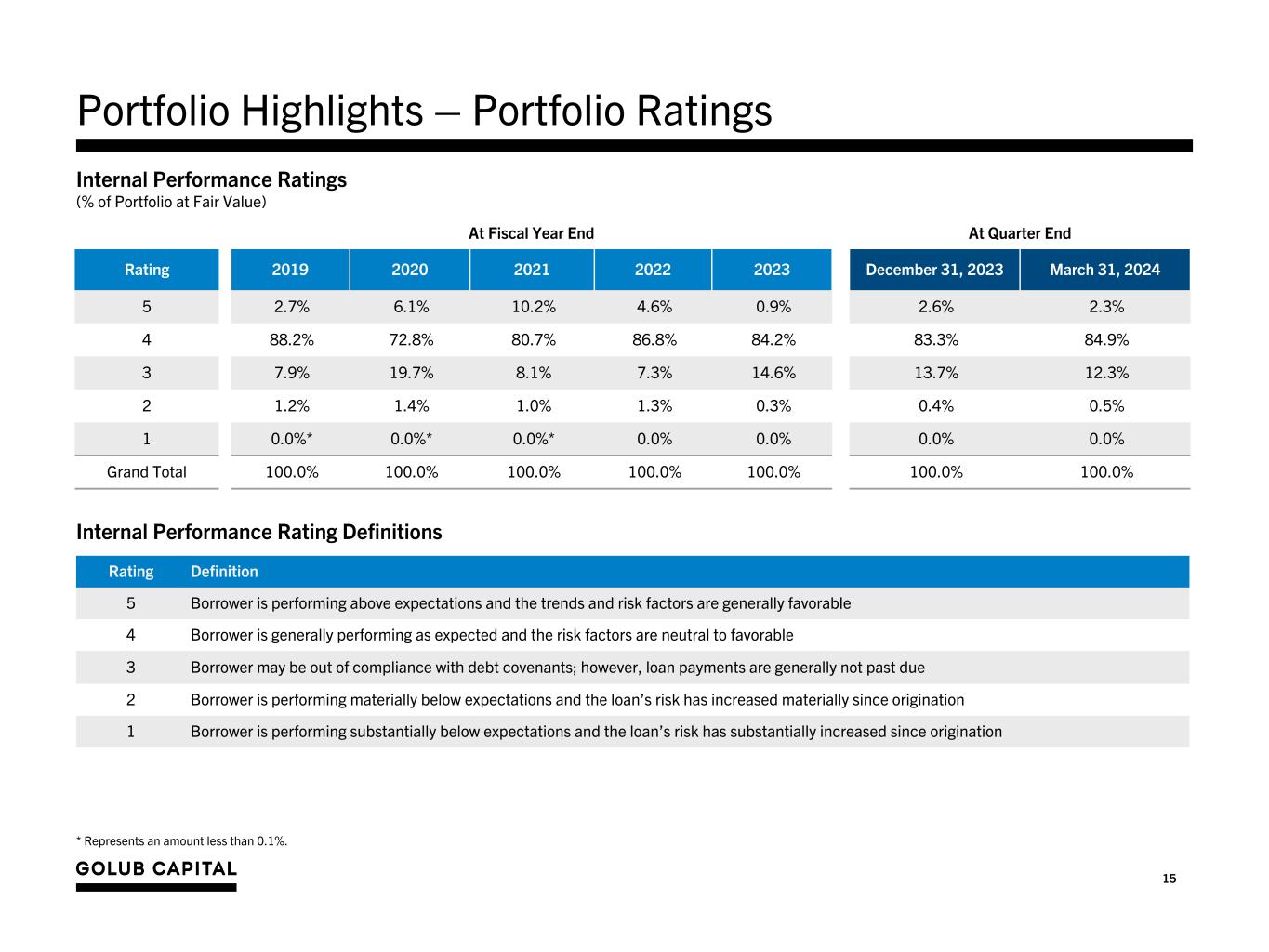 14 – Fundamental credit quality as of March 31, 2024 remained strong with over 87% of the investments in our portfolio at fair value having an Internal Performance Rating1 of 4 or higher as of March 31, 2024. – As of March 31, 2024, non-accrual investments remained low at 1.5% and 0.9% as a percentage of total debt investments at cost and fair value, respectively. – During the quarter ended March 31, 2024, the number of non-accrual investments remained at nine investments as the disposition of one portfolio company investment and the return to accrual status of two portfolio company investments was offset by the addition of three portfolio company investments. Portfolio Highlights - Credit Quality Quarter Ended March 31, 2023 June 30, 2023 September 30, 2023 December 31, 2023 March 31, 2024 Non-Accrual - Debt Investments Non-accrual investments at amortized cost (000s) $142,432 $97,658 $85,745 $87,231 $78,487 Non-accrual investments / total debt investments at amortized cost 2.6% 1.8% 1.6% 1.7% 1.5% Non-accrual investments at fair value (000s) $88,581 $80,362 $62,937 $56,485 $47,668 Non-accrual investments / total debt investments at fair value 1.7% 1.5% 1.2% 1.1% 0.9% Fair Value of Debt Investments Fair value of total debt investments as a percentage of principal (loans) 95.9% 97.0% 97.1% 96.9% 97.4% 1. Please see Internal Performance Ratings definitions on the following page.