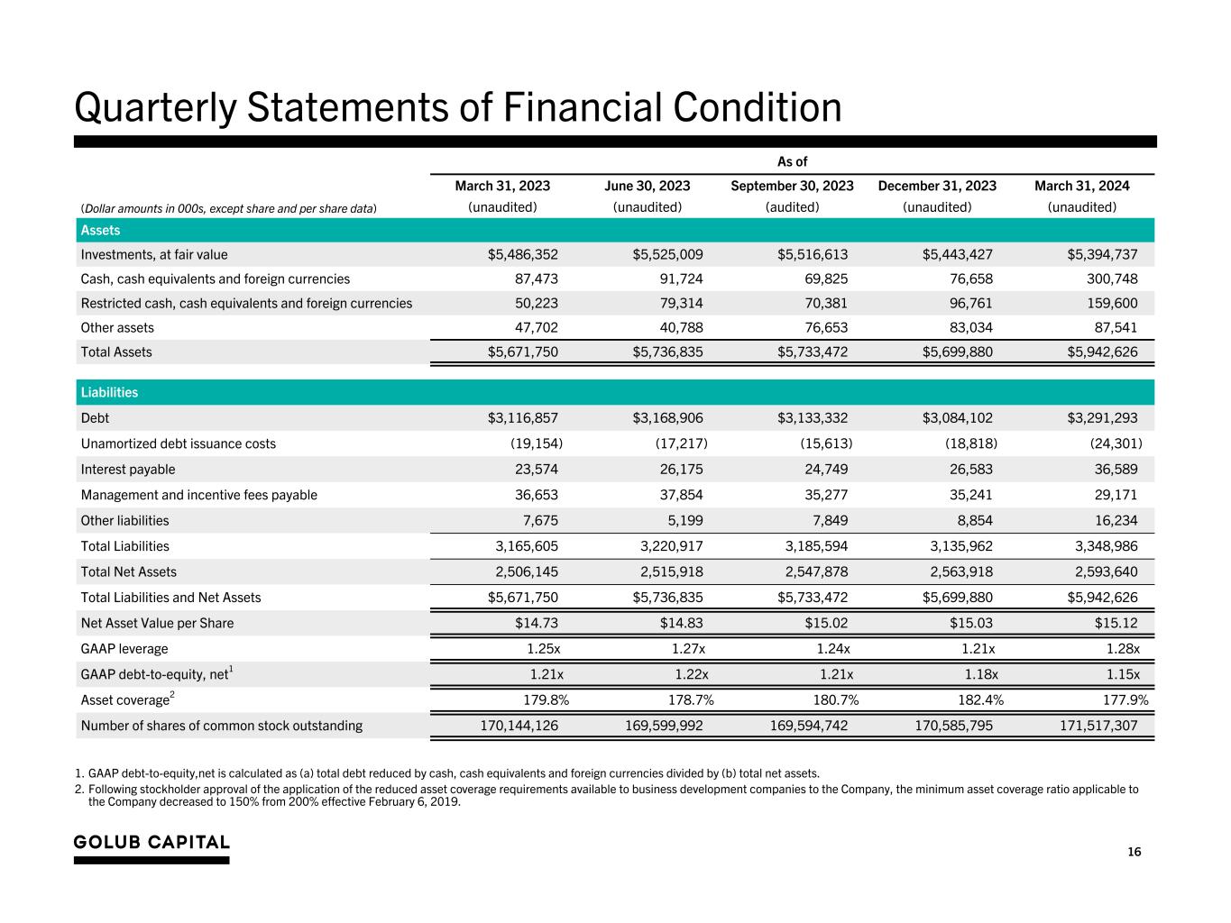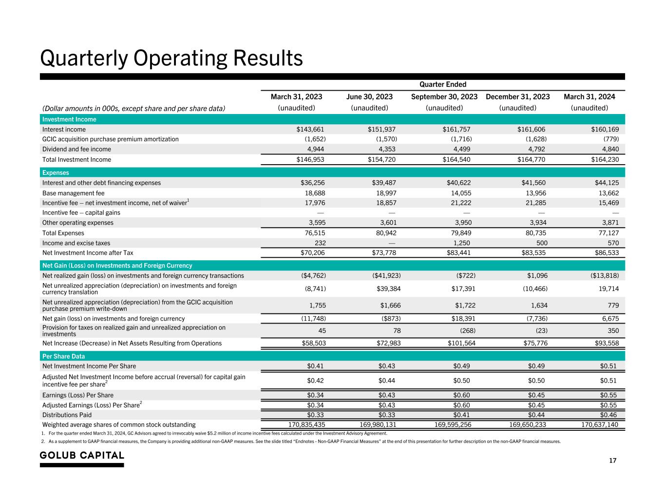 16 Quarterly Statements of Financial Condition As of (Dollar amounts in 000s, except share and per share data) March 31, 2023 June 30, 2023 September 30, 2023 December 31, 2023 March 31, 2024 (unaudited) (unaudited) (audited) (unaudited) (unaudited) Assets Investments, at fair value $5,486,352 $5,525,009 $5,516,613 $5,443,427 $5,394,737 Cash, cash equivalents and foreign currencies 87,473 91,724 69,825 76,658 300,748 Restricted cash, cash equivalents and foreign currencies 50,223 79,314 70,381 96,761 159,600 Other assets 47,702 40,788 76,653 83,034 87,541 Total Assets $5,671,750 $5,736,835 $5,733,472 $5,699,880 $5,942,626 Liabilities Debt $3,116,857 $3,168,906 $3,133,332 $3,084,102 $3,291,293 Unamortized debt issuance costs (19,154) (17,217) (15,613) (18,818) (24,301) Interest payable 23,574 26,175 24,749 26,583 36,589 Management and incentive fees payable 36,653 37,854 35,277 35,241 29,171 Other liabilities 7,675 5,199 7,849 8,854 16,234 Total Liabilities 3,165,605 3,220,917 3,185,594 3,135,962 3,348,986 Total Net Assets 2,506,145 2,515,918 2,547,878 2,563,918 2,593,640 Total Liabilities and Net Assets $5,671,750 $5,736,835 $5,733,472 $5,699,880 $5,942,626 Net Asset Value per Share $14.73 $14.83 $15.02 $15.03 $15.12 GAAP leverage 1.25x 1.27x 1.24x 1.21x 1.28x GAAP debt-to-equity, net1 1.21x 1.22x 1.21x 1.18x 1.15 x Asset coverage2 179.8% 178.7% 180.7% 182.4% 177.9% Number of shares of common stock outstanding 170,144,126 169,599,992 169,594,742 170,585,795 171,517,307 1. GAAP debt-to-equity,net is calculated as (a) total debt reduced by cash, cash equivalents and foreign currencies divided by (b) total net assets. 2. Following stockholder approval of the application of the reduced asset coverage requirements available to business development companies to the Company, the minimum asset coverage ratio applicable to the Company decreased to 150% from 200% effective February 6, 2019.