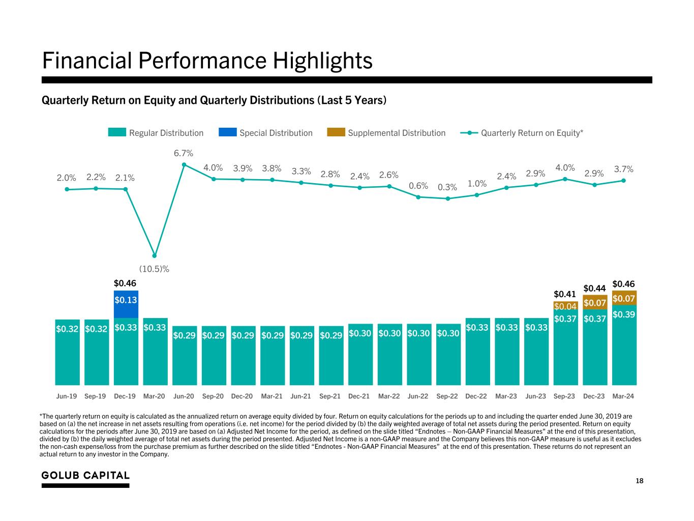 17 Quarterly Operating Results Quarter Ended (Dollar amounts in 000s, except share and per share data) March 31, 2023 June 30, 2023 September 30, 2023 December 31, 2023 March 31, 2024 (unaudited) (unaudited) (unaudited) (unaudited) (unaudited) Investment Income Interest income $143,661 $151,937 $161,757 $161,606 $160,169 GCIC acquisition purchase premium amortization (1,652) (1,570) (1,716) (1,628) (779) Dividend and fee income 4,944 4,353 4,499 4,792 4,840 Total Investment Income $146,953 $154,720 $164,540 $164,770 $164,230 Expenses Interest and other debt financing expenses $36,256 $39,487 $40,622 $41,560 $44,125 Base management fee 18,688 18,997 14,055 13,956 13,662 Incentive fee – net investment income, net of waiver1 17,976 18,857 21,222 21,285 15,469 Incentive fee – capital gains — — — — — Other operating expenses 3,595 3,601 3,950 3,934 3,871 Total Expenses 76,515 80,942 79,849 80,735 77,127 Income and excise taxes 232 — 1,250 500 570 Net Investment Income after Tax $70,206 $73,778 $83,441 $83,535 $86,533 Net Gain (Loss) on Investments and Foreign Currency Net realized gain (loss) on investments and foreign currency transactions ($4,762) ($41,923) ($722) $1,096 ($13,818) Net unrealized appreciation (depreciation) on investments and foreign currency translation (8,741) $39,384 $17,391 (10,466) 19,714 Net unrealized appreciation (depreciation) from the GCIC acquisition purchase premium write-down 1,755 $1,666 $1,722 1,634 779 Net gain (loss) on investments and foreign currency (11,748) ($873) $18,391 (7,736) 6,675 Provision for taxes on realized gain and unrealized appreciation on investments 45 78 (268) (23) 350 Net Increase (Decrease) in Net Assets Resulting from Operations $58,503 $72,983 $101,564 $75,776 $93,558 Per Share Data Net Investment Income Per Share $0.41 $0.43 $0.49 $0.49 $0.51 Adjusted Net Investment Income before accrual (reversal) for capital gain incentive fee per share2 $0.42 $0.44 $0.50 $0.50 $0.51 Earnings (Loss) Per Share $0.34 $0.43 $0.60 $0.45 $0.55 Adjusted Earnings (Loss) Per Share2 $0.34 $0.43 $0.60 $0.45 $0.55 Distributions Paid $0.33 $0.33 $0.41 $0.44 $0.46 Weighted average shares of common stock outstanding 170,835,435 169,980,131 169,595,256 169,650,233 170,637,140 1. For the quarter ended March 31, 2024, GC Advisors agreed to irrevocably waive $5.2 million of income incentive fees calculated under the Investment Advisory Agreement. 2. As a supplement to GAAP financial measures, the Company is providing additional non-GAAP measures. See the slide titled “Endnotes - Non-GAAP Financial Measures” at the end of this presentation for further description on the non-GAAP financial measures.