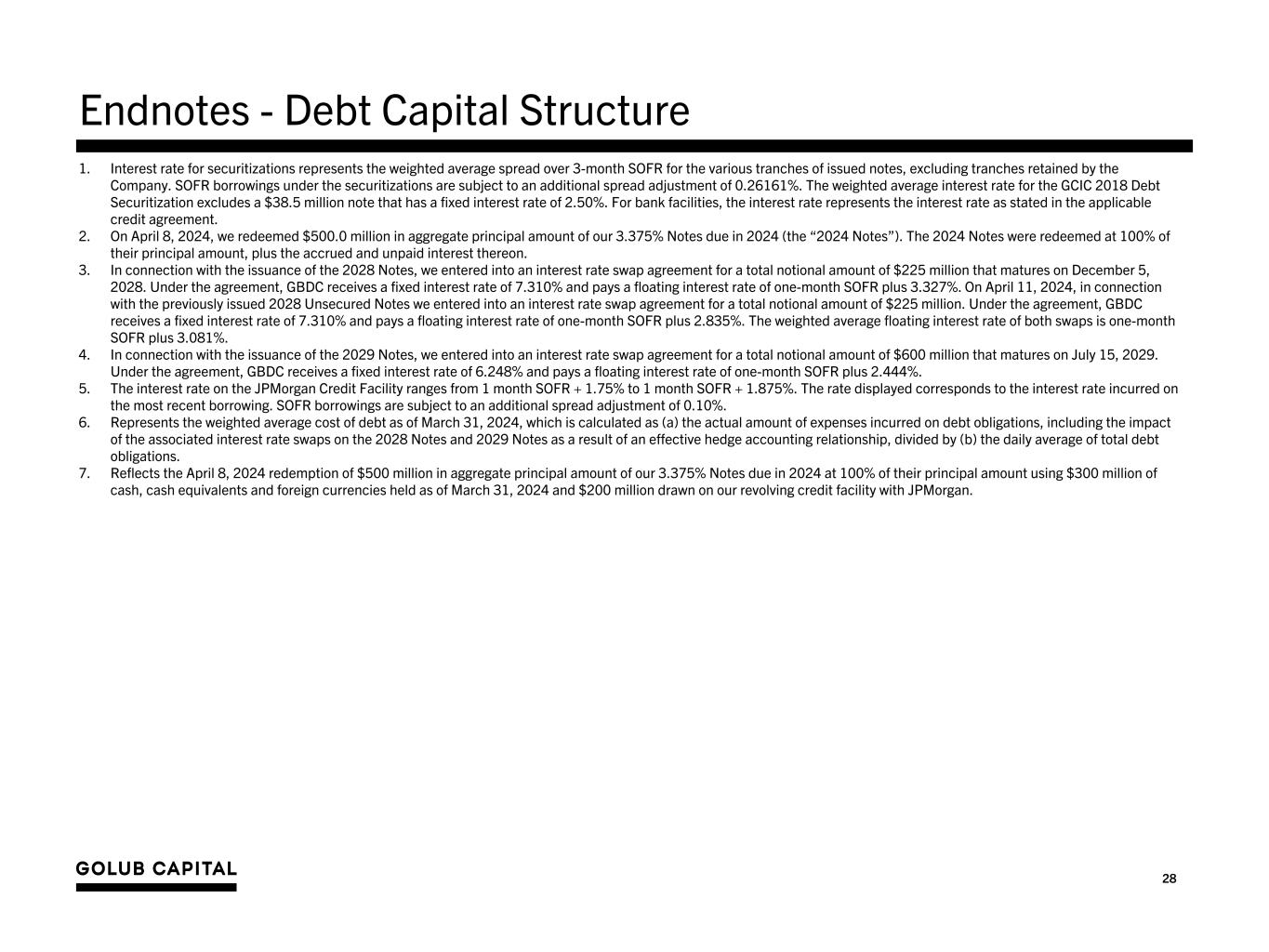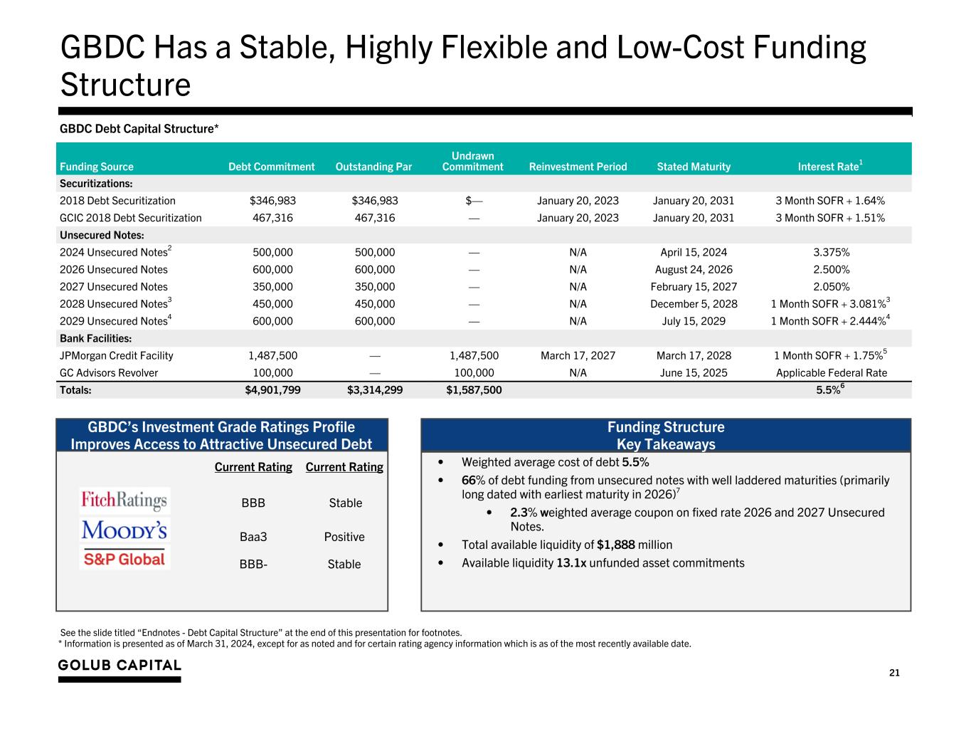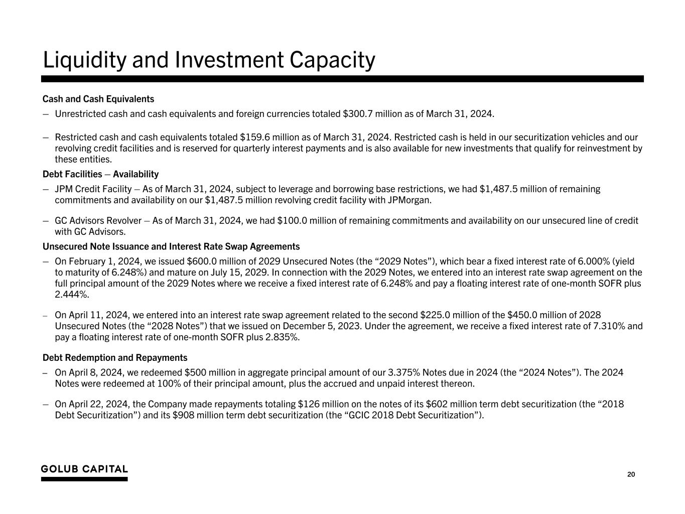 20 Cash and Cash Equivalents – Unrestricted cash and cash equivalents and foreign currencies totaled $300.7 million as of March 31, 2024. – Restricted cash and cash equivalents totaled $159.6 million as of March 31, 2024. Restricted cash is held in our securitization vehicles and our revolving credit facilities and is reserved for quarterly interest payments and is also available for new investments that qualify for reinvestment by these entities. Debt Facilities – Availability – JPM Credit Facility – As of March 31, 2024, subject to leverage and borrowing base restrictions, we had $1,487.5 million of remaining commitments and availability on our $1,487.5 million revolving credit facility with JPMorgan. – GC Advisors Revolver – As of March 31, 2024, we had $100.0 million of remaining commitments and availability on our unsecured line of credit with GC Advisors. Unsecured Note Issuance and Interest Rate Swap Agreements – On February 1, 2024, we issued $600.0 million of 2029 Unsecured Notes (the “2029 Notes”), which bear a fixed interest rate of 6.000% (yield to maturity of 6.248%) and mature on July 15, 2029. In connection with the 2029 Notes, we entered into an interest rate swap agreement on the full principal amount of the 2029 Notes where we receive a fixed interest rate of 6.248% and pay a floating interest rate of one-month SOFR plus 2.444%. – On April 11, 2024, we entered into an interest rate swap agreement related to the second $225.0 million of the $450.0 million of 2028 Unsecured Notes (the “2028 Notes”) that we issued on December 5, 2023. Under the agreement, we receive a fixed interest rate of 7.310% and pay a floating interest rate of one-month SOFR plus 2.835%. Debt Redemption and Repayments – On April 8, 2024, we redeemed $500 million in aggregate principal amount of our 3.375% Notes due in 2024 (the “2024 Notes”). The 2024 Notes were redeemed at 100% of their principal amount, plus the accrued and unpaid interest thereon. – On April 22, 2024, the Company made repayments totaling $126 million on the notes of its $602 million term debt securitization (the “2018 Debt Securitization”) and its $908 million term debt securitization (the “GCIC 2018 Debt Securitization”). Liquidity and Investment Capacity