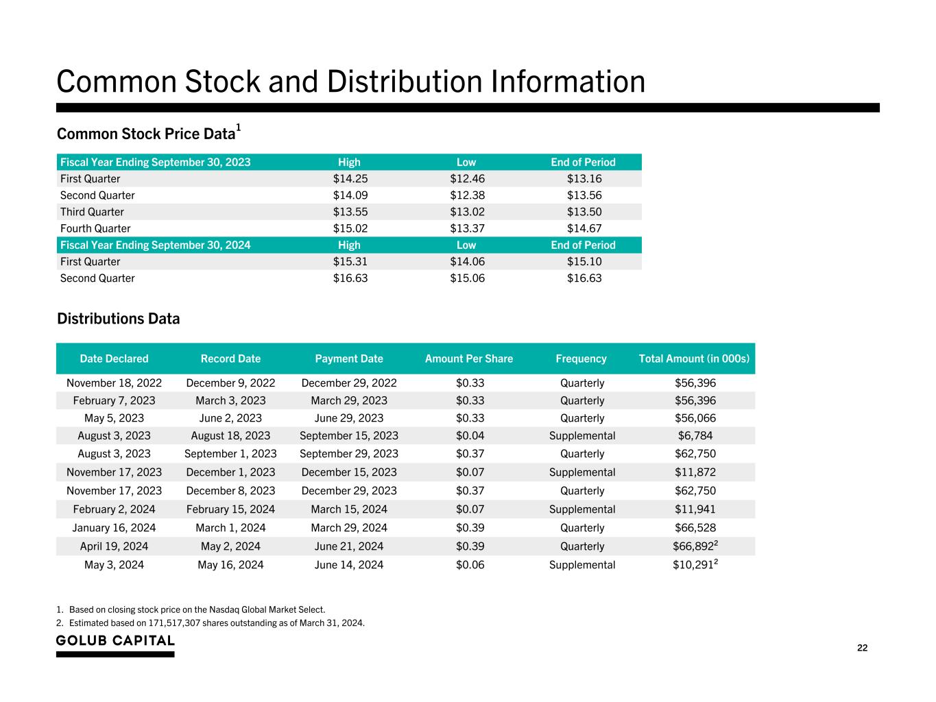 22 Common Stock and Distribution Information Date Declared Record Date Payment Date Amount Per Share Frequency Total Amount (in 000s) November 18, 2022 December 9, 2022 December 29, 2022 $0.33 Quarterly $56,396 February 7, 2023 March 3, 2023 March 29, 2023 $0.33 Quarterly $56,396 May 5, 2023 June 2, 2023 June 29, 2023 $0.33 Quarterly $56,066 August 3, 2023 August 18, 2023 September 15, 2023 $0.04 Supplemental $6,784 August 3, 2023 September 1, 2023 September 29, 2023 $0.37 Quarterly $62,750 November 17, 2023 December 1, 2023 December 15, 2023 $0.07 Supplemental $11,872 November 17, 2023 December 8, 2023 December 29, 2023 $0.37 Quarterly $62,750 February 2, 2024 February 15, 2024 March 15, 2024 $0.07 Supplemental $11,941 January 16, 2024 March 1, 2024 March 29, 2024 $0.39 Quarterly $66,528 April 19, 2024 May 2, 2024 June 21, 2024 $0.39 Quarterly $66,892² May 3, 2024 May 16, 2024 June 14, 2024 $0.06 Supplemental $10,291² Distributions Data Fiscal Year Ending September 30, 2023 High Low End of Period First Quarter $14.25 $12.46 $13.16 Second Quarter $14.09 $12.38 $13.56 Third Quarter $13.55 $13.02 $13.50 Fourth Quarter $15.02 $13.37 $14.67 Fiscal Year Ending September 30, 2024 High Low End of Period First Quarter $15.31 $14.06 $15.10 Second Quarter $16.63 $15.06 $16.63 Common Stock Price Data1 1. Based on closing stock price on the Nasdaq Global Market Select. 2. Estimated based on 171,517,307 shares outstanding as of March 31, 2024.