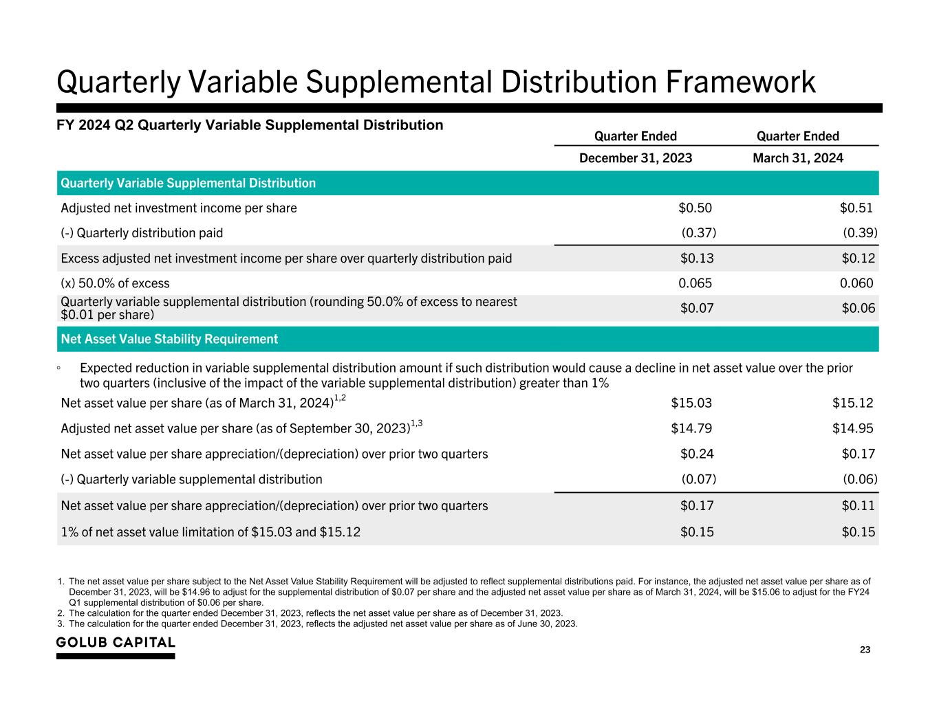 23 1. The net asset value per share subject to the Net Asset Value Stability Requirement will be adjusted to reflect supplemental distributions paid. For instance, the adjusted net asset value per share as of December 31, 2023, will be $14.96 to adjust for the supplemental distribution of $0.07 per share and the adjusted net asset value per share as of March 31, 2024, will be $15.06 to adjust for the FY24 Q1 supplemental distribution of $0.06 per share. 2. The calculation for the quarter ended December 31, 2023, reflects the net asset value per share as of December 31, 2023. 3. The calculation for the quarter ended December 31, 2023, reflects the adjusted net asset value per share as of June 30, 2023. Quarterly Variable Supplemental Distribution Framework FY 2024 Q2 Quarterly Variable Supplemental Distribution Quarter Ended Quarter Ended December 31, 2023 March 31, 2024 Quarterly Variable Supplemental Distribution Adjusted net investment income per share $0.50 $0.51 (-) Quarterly distribution paid (0.37) (0.39) Excess adjusted net investment income per share over quarterly distribution paid $0.13 $0.12 (x) 50.0% of excess 0.065 0.060 Quarterly variable supplemental distribution (rounding 50.0% of excess to nearest $0.01 per share) $0.07 $0.06 Net Asset Value Stability Requirement Net asset value per share (as of March 31, 2024)1,2 $15.03 $15.12 Adjusted net asset value per share (as of September 30, 2023)1,3 $14.79 $14.95 Net asset value per share appreciation/(depreciation) over prior two quarters $0.24 $0.17 (-) Quarterly variable supplemental distribution (0.07) (0.06) Net asset value per share appreciation/(depreciation) over prior two quarters $0.17 $0.11 1% of net asset value limitation of $15.03 and $15.12 $0.15 $0.15 ◦ Expected reduction in variable supplemental distribution amount if such distribution would cause a decline in net asset value over the prior two quarters (inclusive of the impact of the variable supplemental distribution) greater than 1%